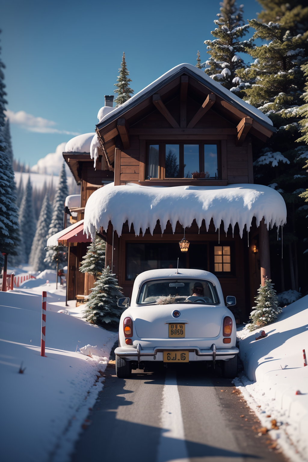 <lora:éªé:0.8>,cs,snow,outdoors,no humans,ground vehicle,scenery,motor vehicle,sky,snowman,car,tree,day,blue sky,winter,blurry,house,building,road,cloud,depth of field,