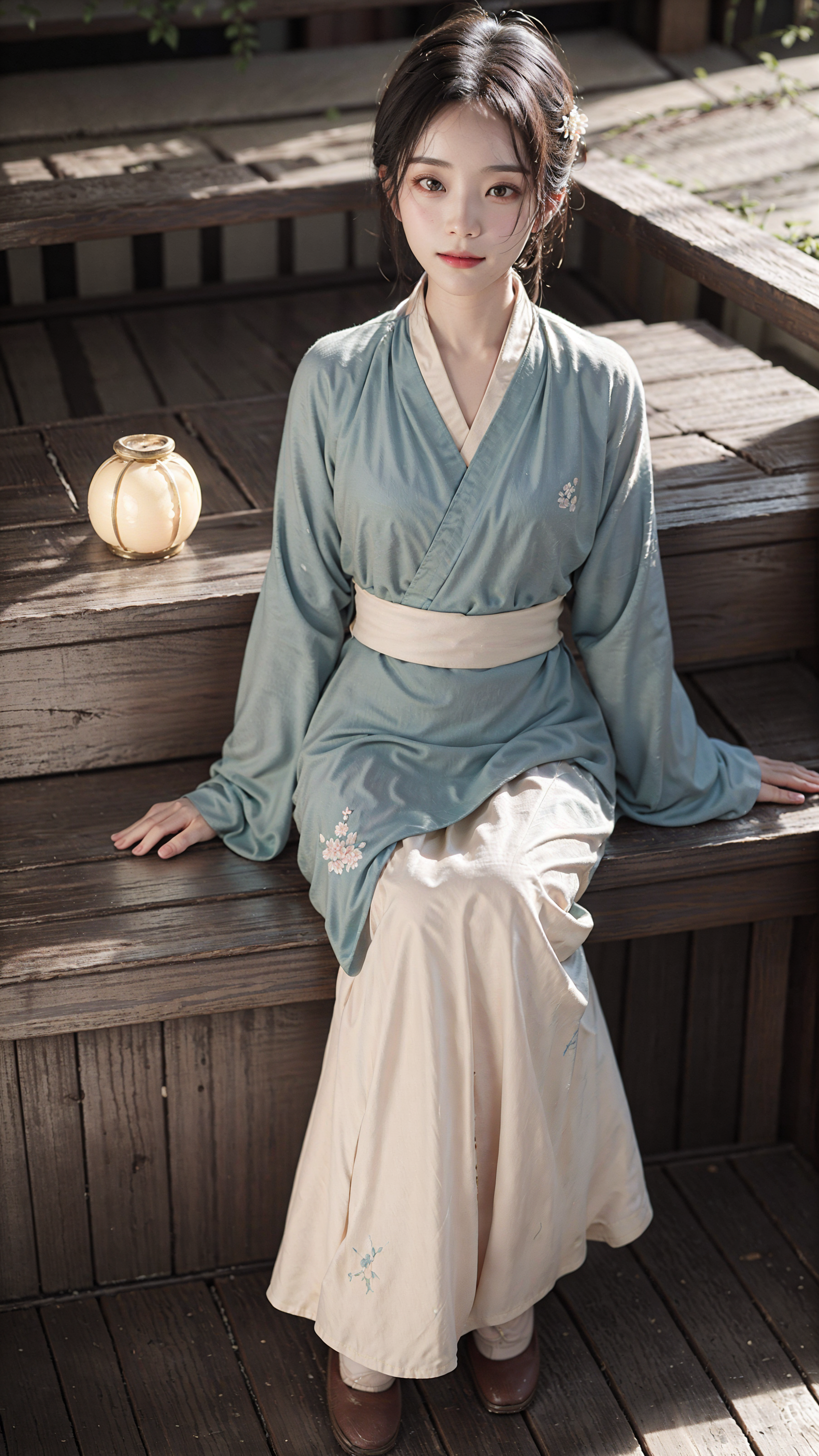 (photorealistic:1.4),8k,(masterpiece), best quality, highest quality, (detailed face:1.5),original,highres, unparalleled masterpiece, ultra realistic 8k, perfect artwork, ((perfect female figure)),mature female, milf, narrow waist, skinny,detailed skin, 1girl, solo, dress, sitting, black hair, short hair, hair ornament, white dress, outdoors, Chinese style courtyard, Chinese style,(hanfu:1.3), song style,full body, smile, standing, river, riverbank, <lora:japan_film_v20:0.2> <lora:sd-No.170-000014:0.6> <lora:hanfu_v30:0.3>