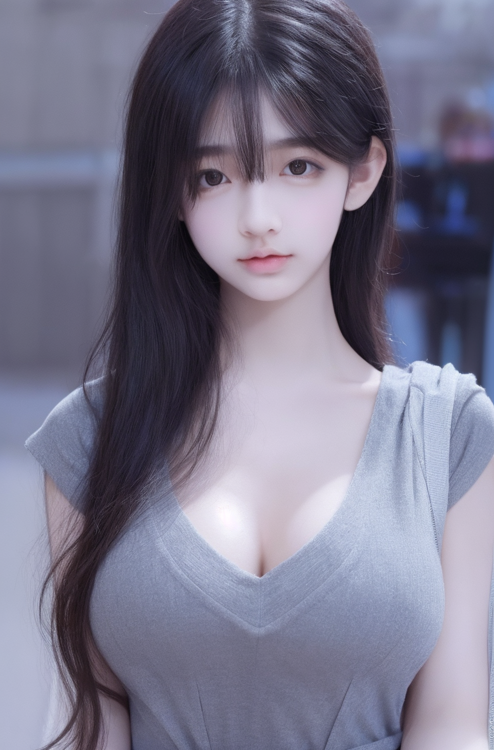 Best quality,masterpiece,ultra high res,(photorealistic:1.4),raw photo,1girl,in the dark,deep shadow,low key,cold light,lvxiaolinzi,upper body,blur background,cleavage,
