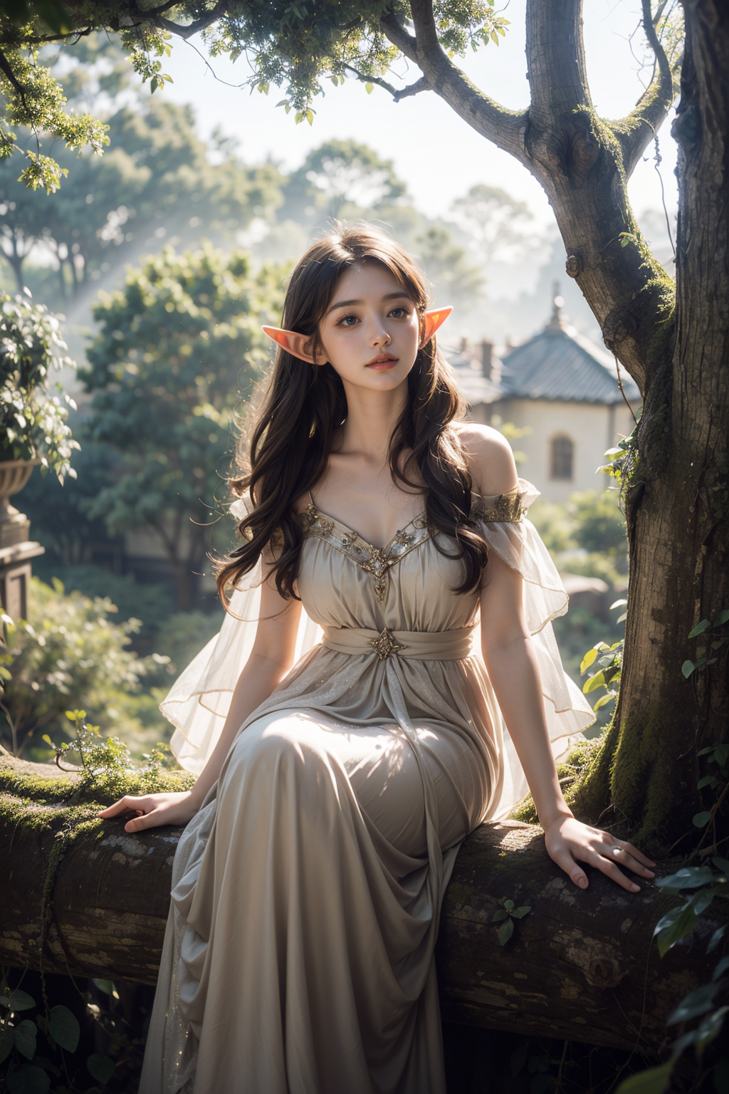 era elf,(giant elves sit on the treetops:1.2),enchanting beauty,(fantasy),(elf mother tree),(world tree),ethereal glow,pointed ears,delicate facial features,long elegant hair,mystical ambiance,soft lighting,tranquil expression,harmonious with nature,subtle magical elements,serene,dreamlike quality,pastel colors,(castle)
