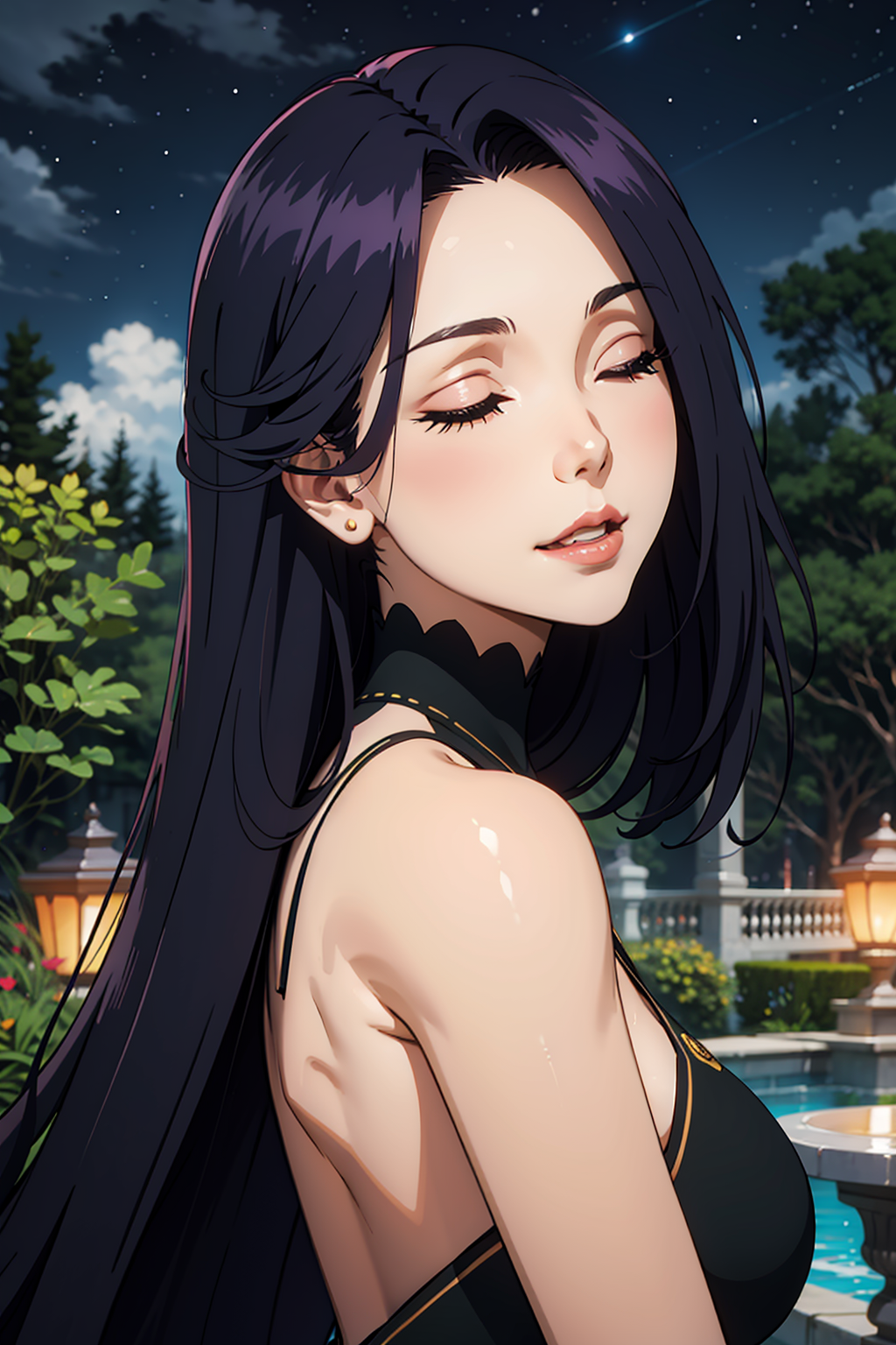 from side, close up, (night time), starry sky, victorian architecture, (garden view), nature, flowers, large balcony, 1girl, beautiful, beauty, huge breast, sagging breast, detailed face, detailed eyes, jet black hair, long hair, crimson red eyes, red lips, slihtly make up, snow white skin, shiny skin, (dark blue dress), one piece dress, eleborate dress, standing on the balcony, (closed eyes, sincere smile), looking at viewer, (mater piece, best quality, 8K, UHD, extreme detailed description, professional, studio lighting, sharp focus, natural lighting, highres, ultra detailed 8K CG, perfect lighting, exremely detailed background, eleborate atmosphere:0.75, fantastical colors, vivid colors, soft HDR), <lora:Aurora_Eminence_Shadow-KK77-V2:0.45>