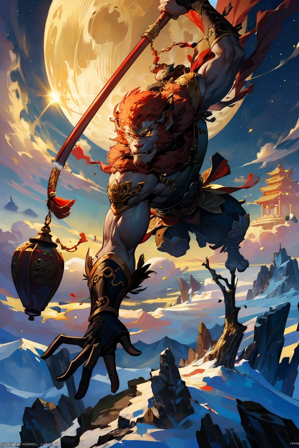(highres:1.4),official art, unity 8k wallpaper, ultra detailed, beautiful and aesthetic, masterpiece, best quality, realistic, (fractal art), epic scene, highres, (masterpiece), (best quality), pov from above, Sun Wukong, ([golden:red]:0.4) fur, ([heavy Chinese armor:red cape]:0.4), (one hand holding the Golden Cudgel:1.2), ([monkey king|Sun Wukong]) stomp on ground ready to fly to the top of an ancient Chinese temple ready to battle, tall ancient Chinese temple, night, night sky, (cracked ground:1.2), feet on ground, monkey walking on ground, snow and cloud on the horizon, flying,<lora:zhongfenghuaxiyou:0.6>