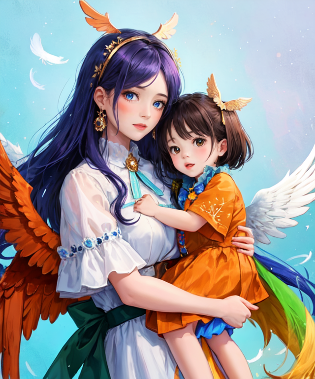 a woman and a child in art work with feathers and color on it's wings, with a winged halo on top of her holding a young child is a child on their head and wings over her chest, surrounded by colors of yellow, blue, red, green, blue, orange and purple, and orange and pink, white,