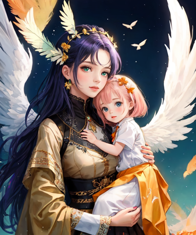 a woman and a child in art work with feathers and color on it's wings, with a winged halo on top of her holding a young child is a child on their head and wings over her chest, surrounded by colors of yellow, blue, red, green, blue, orange and purple, and orange and pink, white,