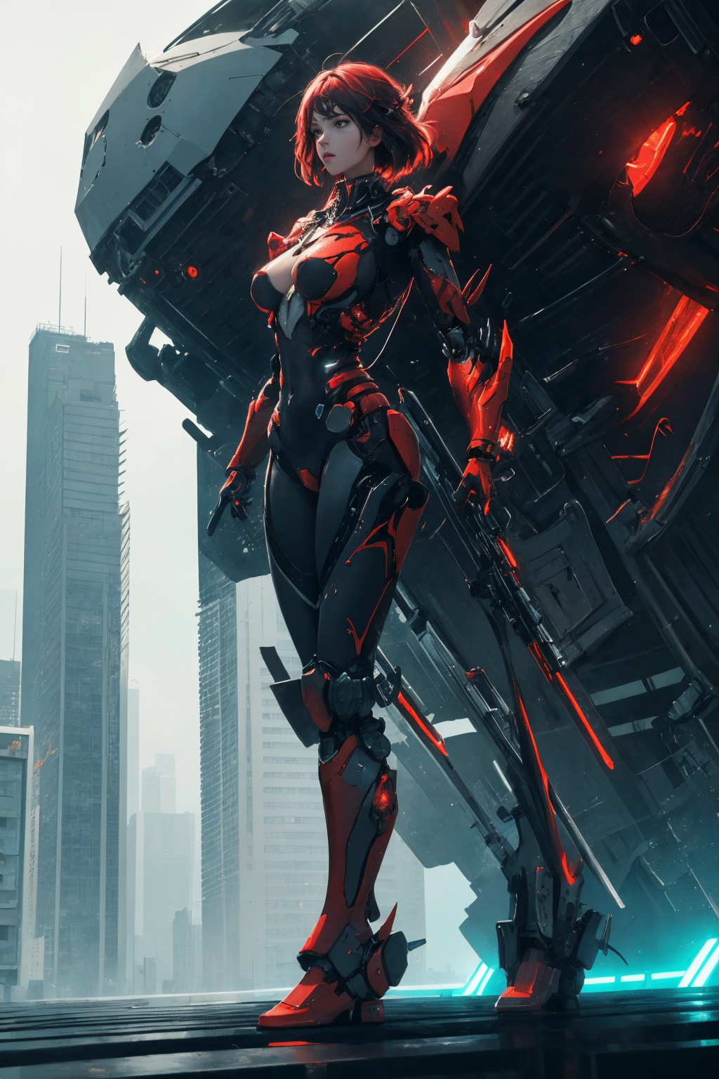 1girl, <lora:animetarotV51:0.2>,future city,dramatic angle,full body,giant red mech maiden,<lora:mecha_20230530090512:0.45>,skyscraper ruins background,cinema-level detail,a large complex neon light aperture serves as the background,correct anatomy, <lora:ClothingAdjuster:1>, 8k, RAW photo, best quality, masterpiece, realistic, photo-realistic, extremely detailed CG unity 8k wallpaper