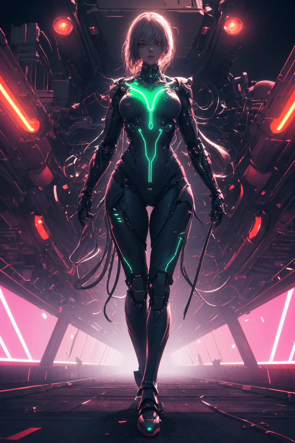 1girl solo, future city,dramatic angle,full body,giant write mech gril,<lora:mecha_20230530090512:0.45>,skyscraper ruins background,cinema-level detail,(a large complex neon light aperture serves as the background,correct anatomy:1.3),, 8k, RAW photo, best quality, masterpiece, realistic, photo-realistic, extremely detailed CG unity 8k wallpaper