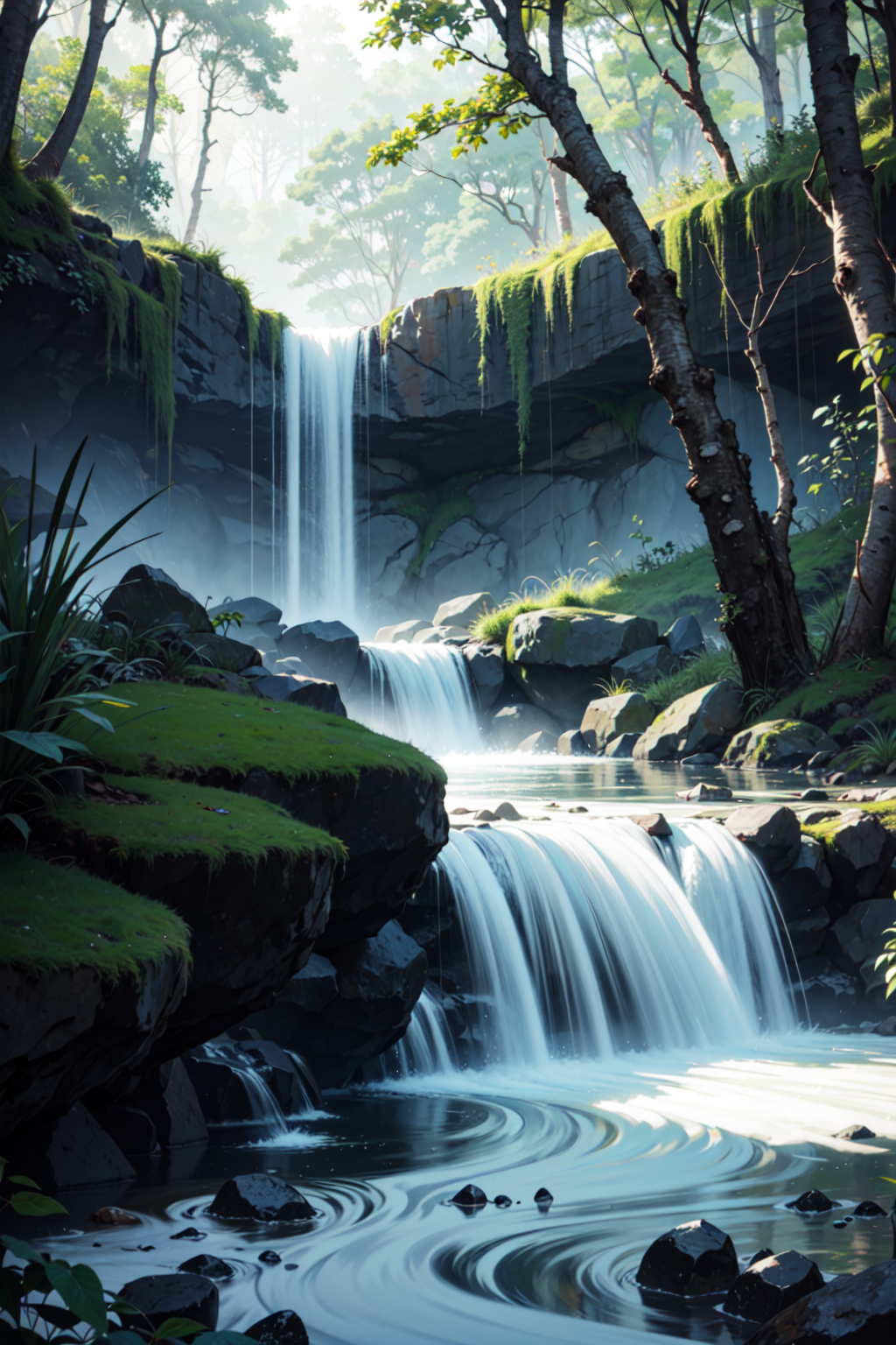 ((best quality, masterpiece, absurdres, )) Enigmatic Forest, Vibrant Colors, Soft Sunlight, Secret Waterfall, Bohemian Fashion