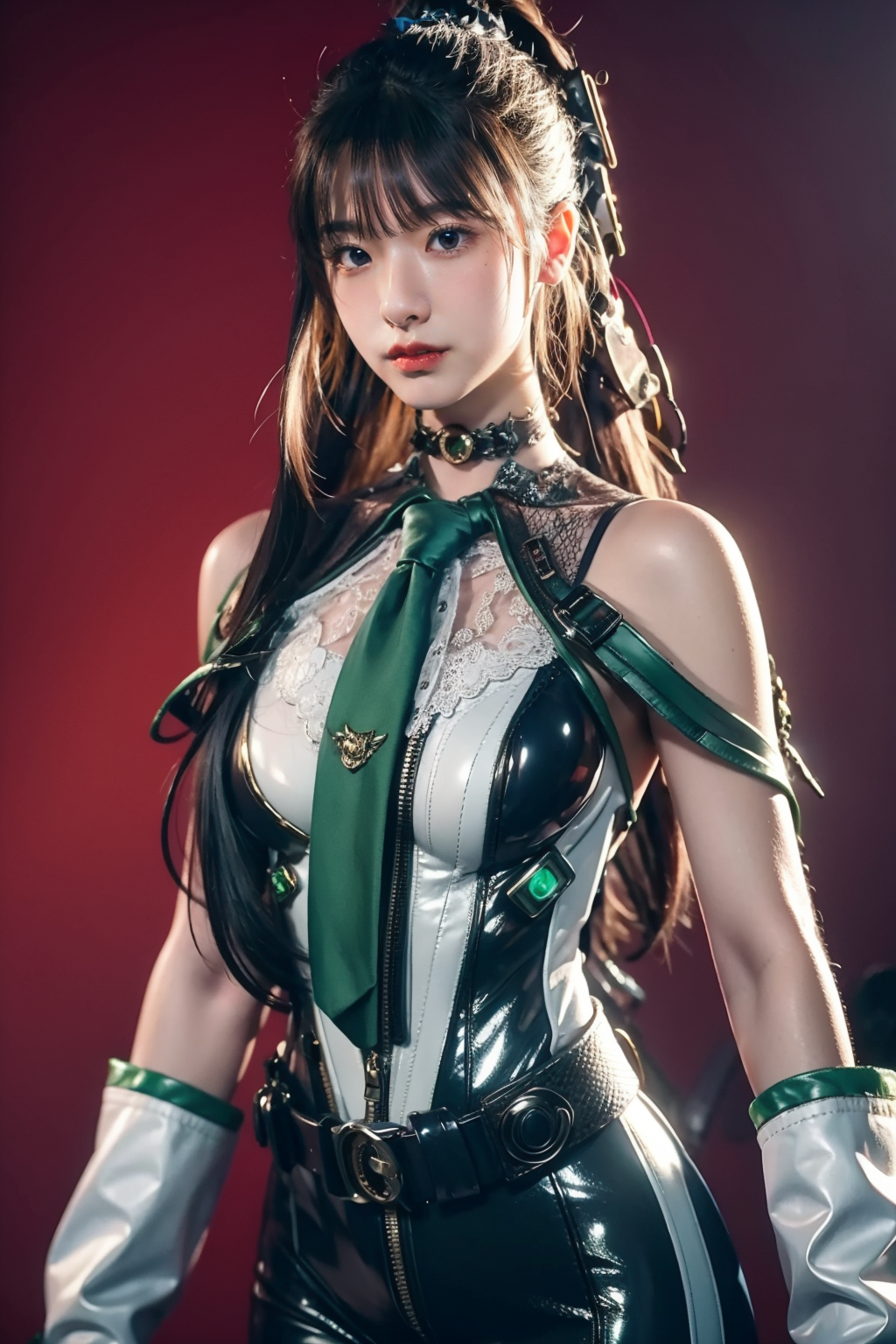 solo,1Girl,red background,cowboy shot,,ruanyi0515,belt,bodysuit,choker,fingerless gloves,glowing,green necktie,see-through,zipper,sleeveless,clothes writing,mecha musume,mechanical parts,spine,hair ornament,hair stick,white gloves,,<lora:0515 Stellar Blade Battle Suit 3_v1:1>,<lora:detail_slider_v4:2>, best quality,masterpiece,highres,official art,extremely detailed cg unity 8k wallpaper