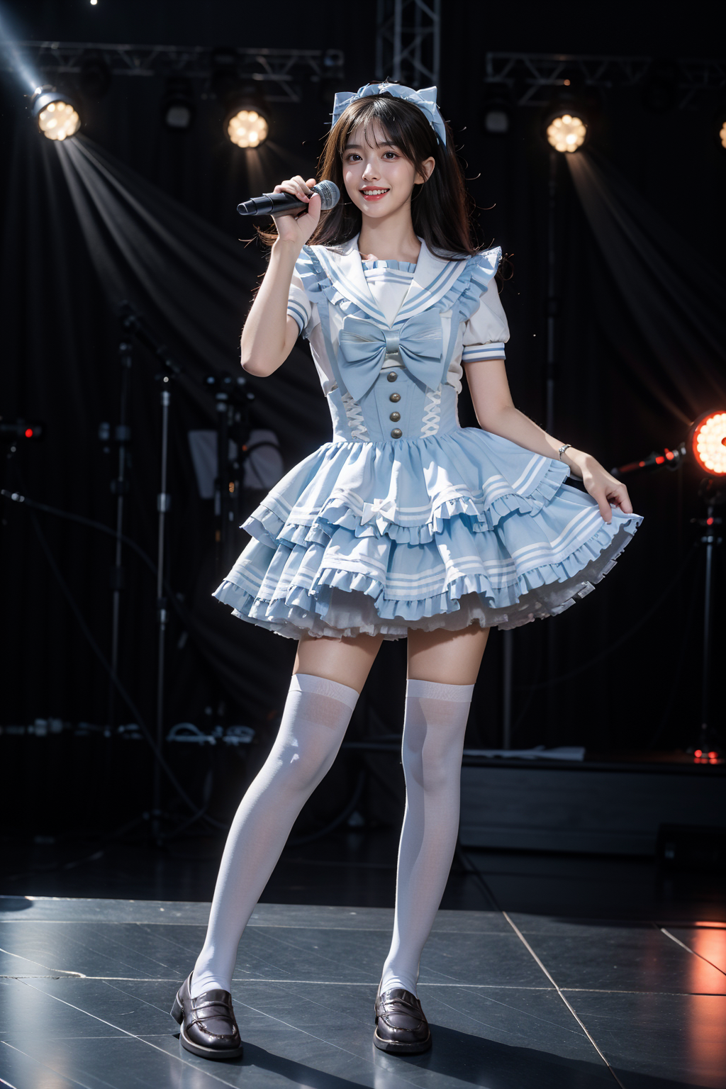 best quality, masterpiece, realistic, photorealistic, 1girl, solo, grin, standing, full body, (holding microphone:1.2), voice actor, singing, cyb dress, dress, light blue dress, short sleeves, frilled dress, layered dress, suspender skirt, white shirt, frills, sailor collar, bow, white thighhighs, loafers, stage, stage in the backgorund, stage lighting, stage spotlight, detailed background, audience, people , <lora:idol_costume_style9_v1:0.7>