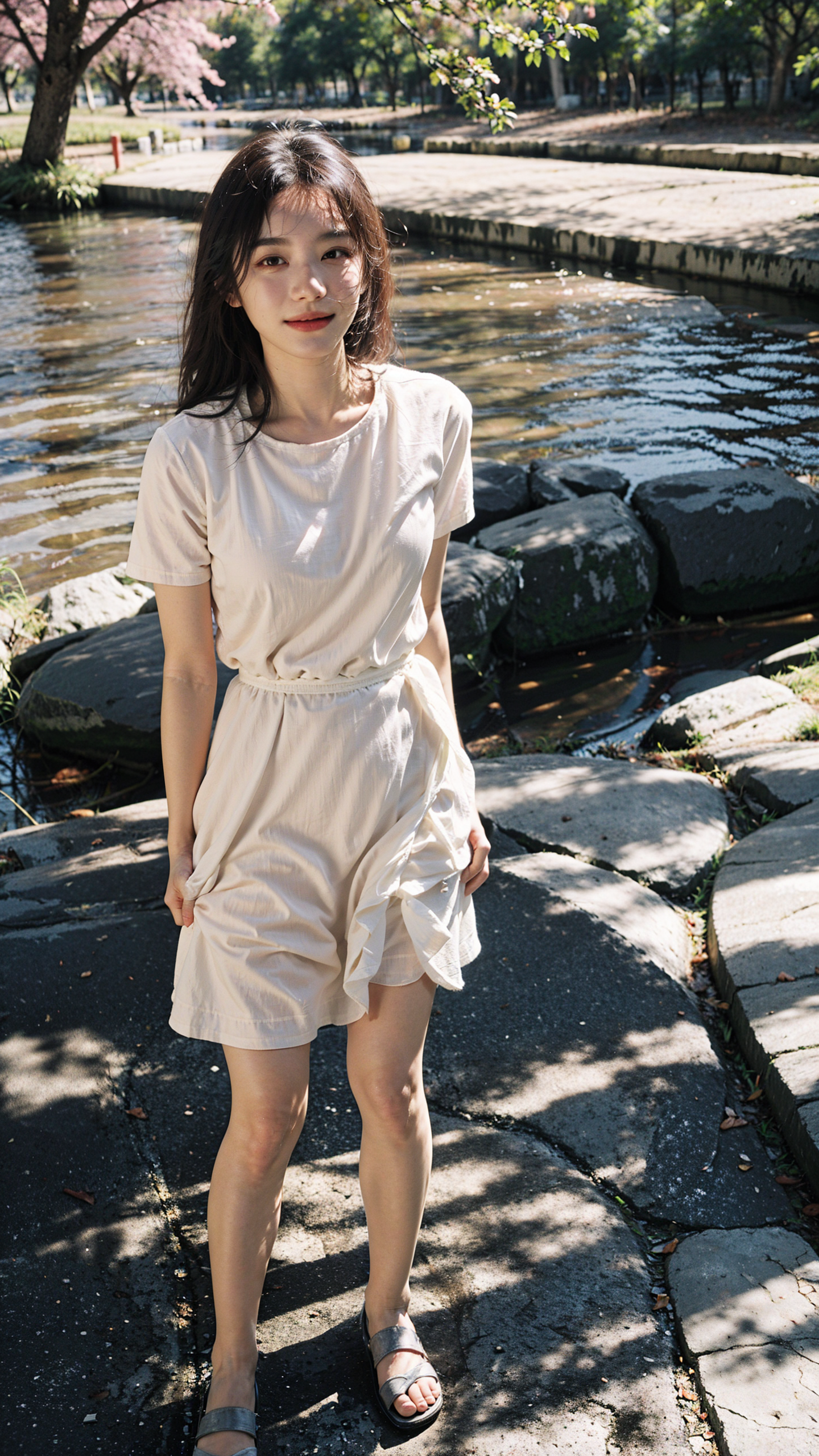 (photorealistic:1.4),8k, (masterpiece), best quality, highest quality, (detailed face:1.5),original,highres, unparalleled masterpiece, ultra realistic 8k, perfect artwork, ((perfect female figure)),mature female, (narrow waist:1.4), (skinny:1.4),depth_of_field,depth of field, (1girl:1.3), (full legs: 1.5),detailed skin, solo ,afternoon,sunset,dappled sunlight,tree ,tree shadow,forest,nature,outdoors, shiny skin, full body,dress, white shirt, open shirt, slim legs, dessert, (river:1.4),(riverbank:1.4),lake,smile, happy, spring ,sakura,cherry blossoms, sandals, white skirt,white dress,flower dress,patterned legwear,long skirt, standing on liquid, playing water, <lora:FilmG4:0.6> <lora:sd-No.170-000014:0.6> <lora:japan_film_v20:0.6>