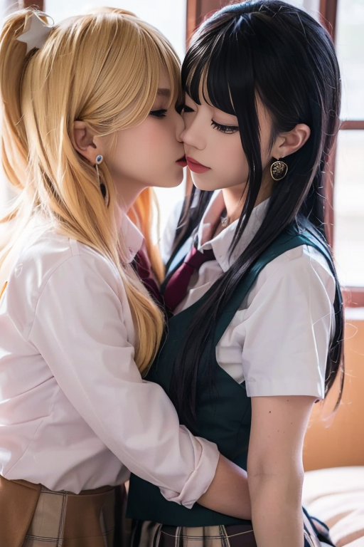 ltra-detailed,highly detailed,best quality,masterpiece,illustration,realistic,photorealistic, citrus, multiple girls, 2girls, yuri, school uniform, vest, shirt, necktie, skirt, black hair, blonde hair, jewelry, earrings, long hair, star hair ornament, hair ornament, bangs, ponytail, looking at another, hug, kiss, blurry background, <lora:citrus_v10_08:0.7>