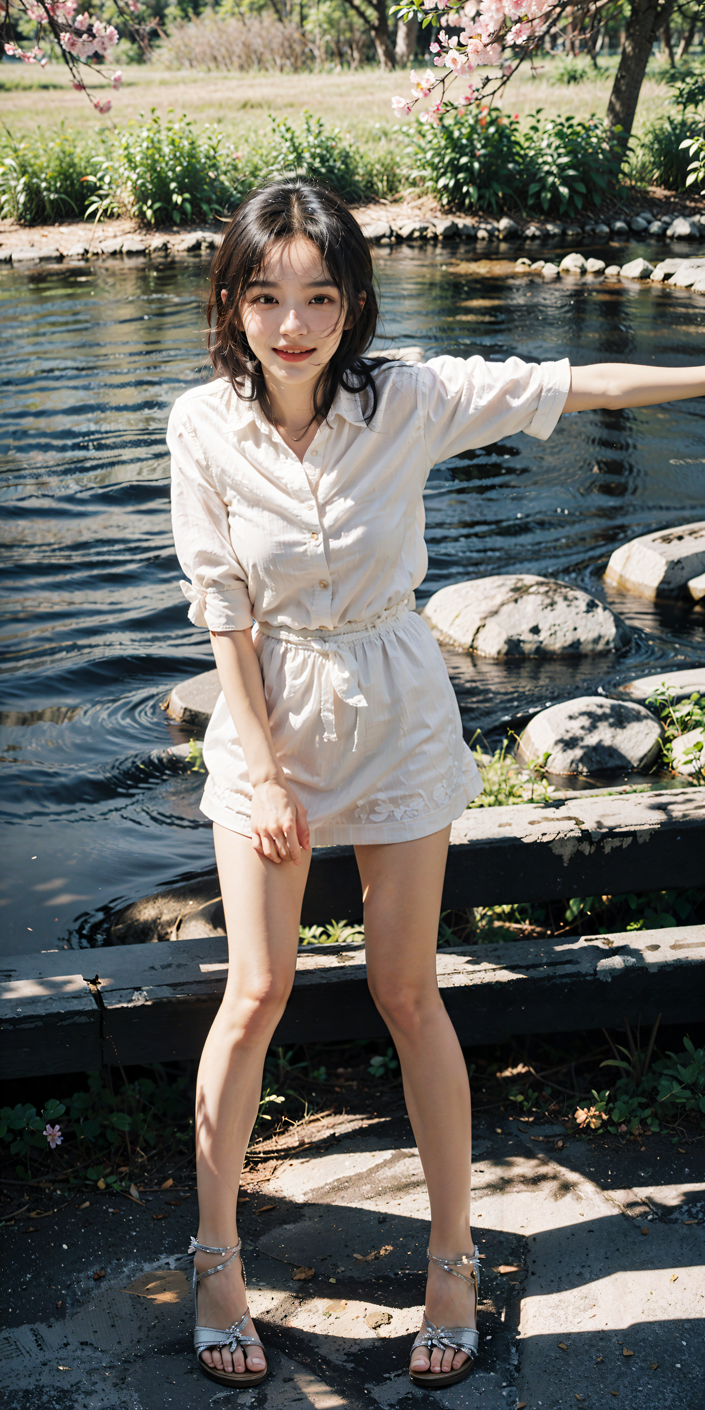 (photorealistic:1.4),8k, (masterpiece), best quality, highest quality, (detailed face:1.5),original,highres, unparalleled masterpiece, ultra realistic 8k, perfect artwork, ((perfect female figure)),mature female, (narrow waist:1.4), (skinny:1.4),depth_of_field,depth of field, (1girl:1.3), (full legs: 1.5),detailed skin, solo ,afternoon,sunset,dappled sunlight,tree ,tree shadow,forest,nature,outdoors, shiny skin, full body,dress, white shirt, open shirt, slim legs, dessert, (river:1.4),(riverbank:1.4),lake,smile, happy, spring ,sakura,cherry blossoms, sandals, white skirt,white dress,flower dress,patterned legwear,long skirt, standing on liquid, playing water, <lora:FilmG4:0.6> <lora:sd-No.170-000014:0.6> <lora:japan_film_v20:0.6>