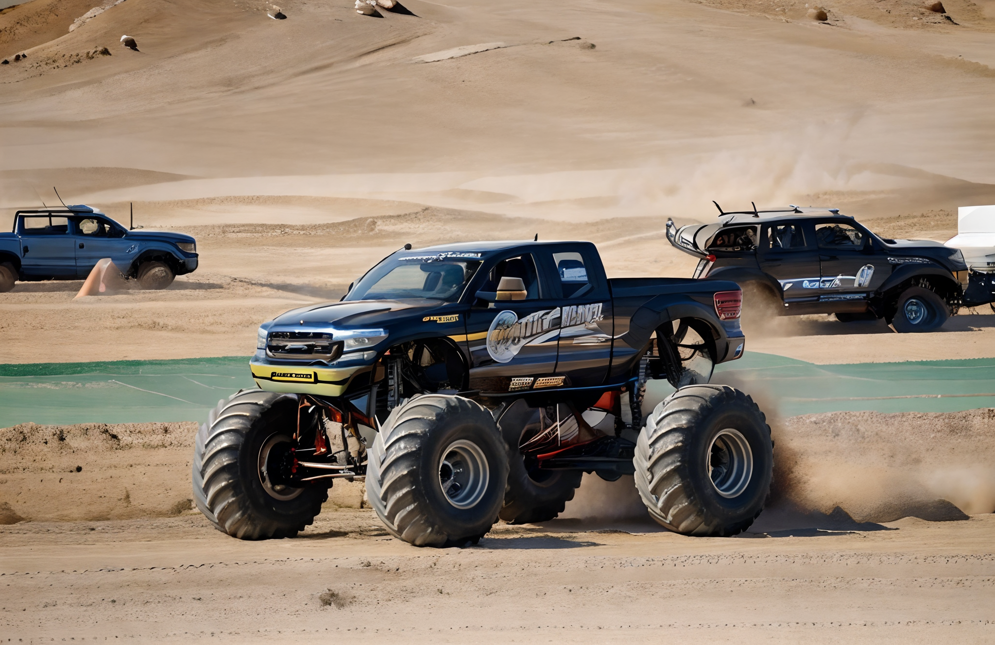<lora:monster truck:0.8>,a monster truck,motor vehicle,ground vehicle,vehicle focus,car,no humans,truck,4 wheel,tire,english text,