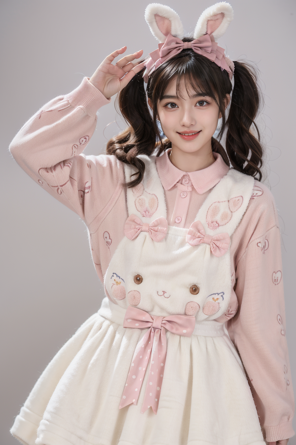 best quality, masterpiece, realistic, photorealistic, 1girl, solo, looking at viewer, smile, standing, twintails, black hair, long hair, dynamic pose, cowboy shot, cyb dress, rabbit dress, white dress, rabbit skirt, shirt, animal print shirt, long sleeves, bow, pink bow, rabbit print, simple grey background, <lora:cute_attire_style3_v1:0.7>