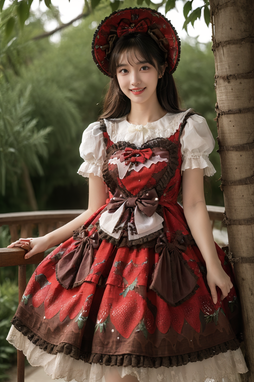 best quality,masterpiece,realistic,photorealistic,1girl,solo,looking at viewer,smile,long hair,black hair,straight hair,standing,cowboy shot,cyb dress,layered dress,print dress,frilled dress,strawberry print,dress bow,bow,hair bow,hat,garden,flower,tree,water,detailed background,<lora:lo_dress_vol3_style3_v1:0.75>,<lora:Background_Detail_v3:1.5>,