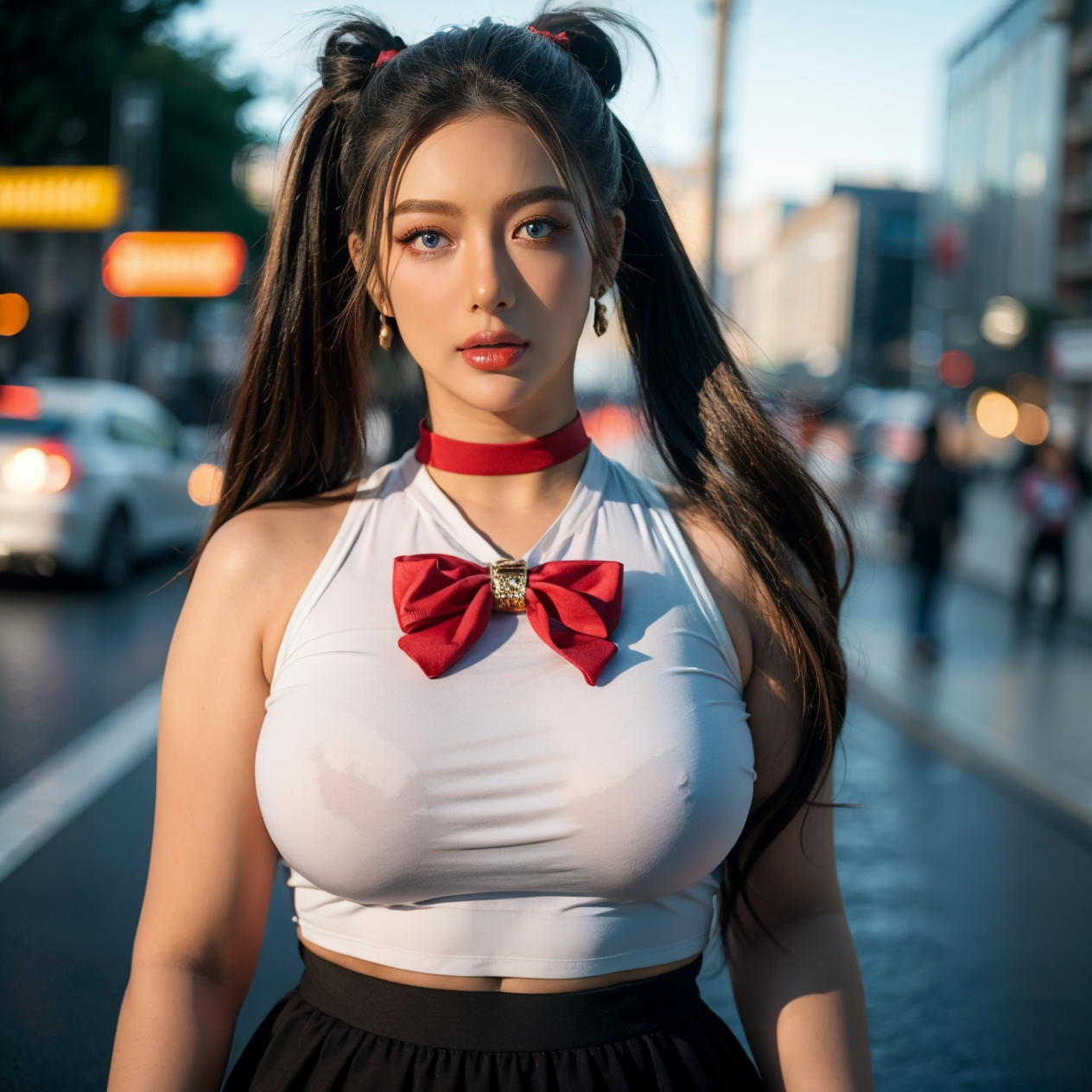 plump,thick busty girl,Ultra-realistic 8k CG,masterpiece,best quality,(photorealistic:1.4),HDR,absurdres,Professional,RAW photo,lens flare,(film grain:1.1),Bokeh,((Depth of field)),aausagi,double bun,twintails,parted bangs,circlet,jewelry,earrings,choker,red bow,white gloves,elbow gloves,blue skirt,<lora:venus body2:0.7>,curvy,<lora:add_detail:1>,<lora:sailor_moon_v1:0.7:lbw=1,1,1,1,0,0,1,0,0,0,1,0,0,0,0,0,0>,