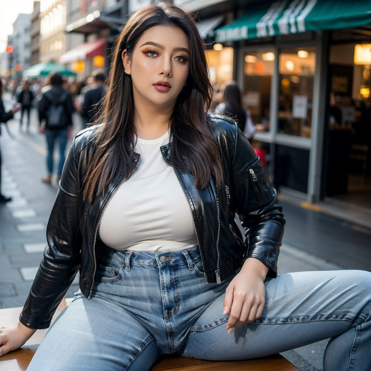 <lora:sukeke-000009:0.6>,1girl,sugar,mywife,plump,thick busty girl,Ultra-realistic 8k CG,masterpiece,best quality,(photorealistic:1.4),HDR,absurdres,Professional,RAW photo,lens flare,(film grain:1.1),Bokeh,((Depth of field)),(Leather_jacket,Black_jeans,Street_coffee_shop_background:1.2),makeup,curvy,thick thighs,<lora:add_detail:1>,<lora:venus body2:0.7>,