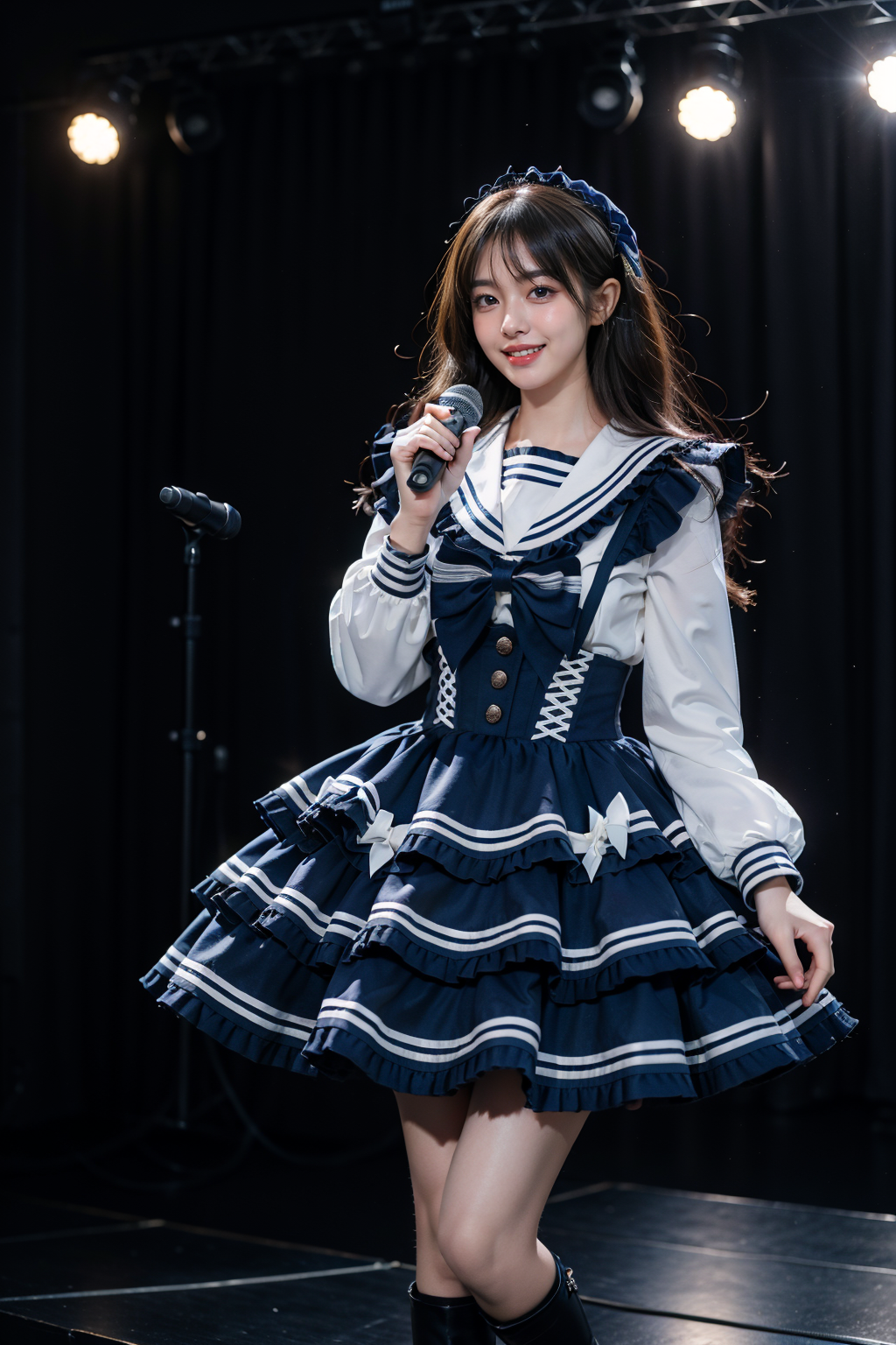 best quality, masterpiece, realistic, photorealistic, 1girl, solo, grin, standing, full body, (holding microphone:1.2), voice actor, singing, cyb dress, dress, dark blue dress, long sleeves, frilled dress, layered dress, suspender skirt, white shirt, frills, sailor collar, bow, knee boots, stage in the backgorund, stage lighting, stage spotlight, detailed background, audience, people , <lora:idol_costume_style9_v1:0.7>