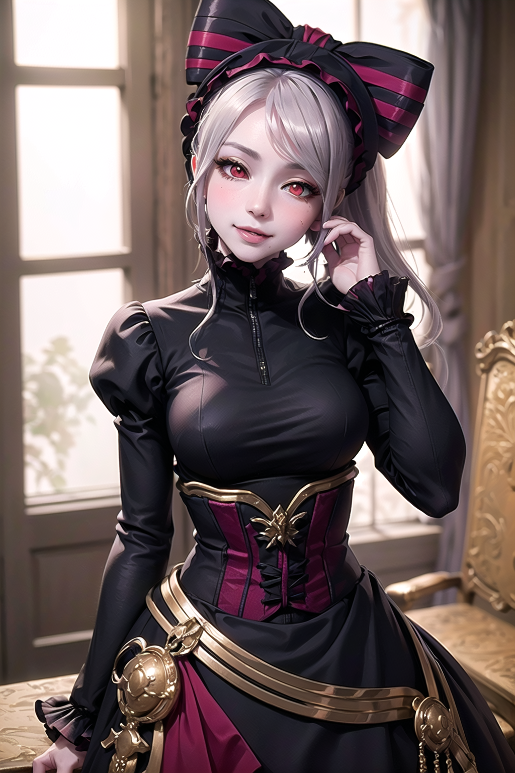 official art, unity 8k wallpaper, ultra detailed, beautiful and aesthetic, beautiful, masterpiece, best quality, portrait, (finely detailed beautiful eyes: 1.2), shalltear, cute, medium breasts, pale skin, (glowing red eyes:1.1), long gray hair, ponytail, (bonnet, large hair bow:1.2), (frilled black dress:1.2), (long sleeves:1.1), captivating pose, arms at sides, half-closed eyes, smile, fang, blush, parted lips, seductive, lustful, hand on own face, head tilt, (looking at viewer:1.1), upper body, from above, throne room, <lora:SHALLTEAR:0.7>