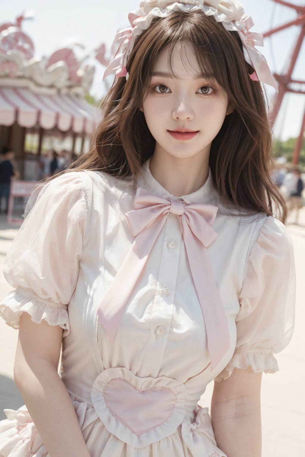 <lora:sweet_attire_style5_v1:0.6>, cyb dress, best quality, masterpiece, illustration, realistic, photo-realistic, amazing, finely detail, incredibly absurdres, huge filesize, ultra-detailed, highres, extremely detailed CG unity 8k wallpaper, nsfw, A close-up, high-resolution photo of a young Korean female idol wearing a pink layered dress with frills, short sleeves, a ribbon bow, and a heart symbol on it. The dress has a sheer, gauzy texture that adds a touch of ethereal beauty. She is standing in an amusement park, looking youthful and innocent. Her long, wavy hair cascades down her shoulders, framing her delicate features. A soft smile graces her lips, revealing a hint of playfulness and charm.