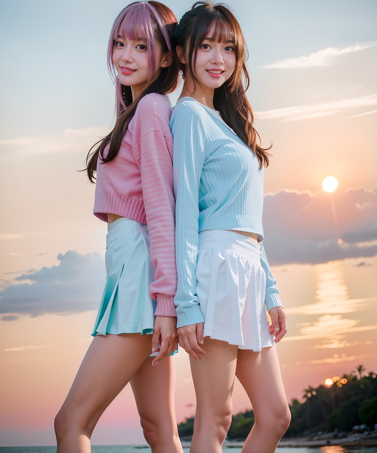 2girls, (looking at viewer:1.2),smile, parted lips , pink shirt, blue sweater, white skirt, shorts, long hair, beach, ocean, sunset, open hand, masterpiece,best quality,ultimate details,highres,8k,wallpaper,extremely clear,
