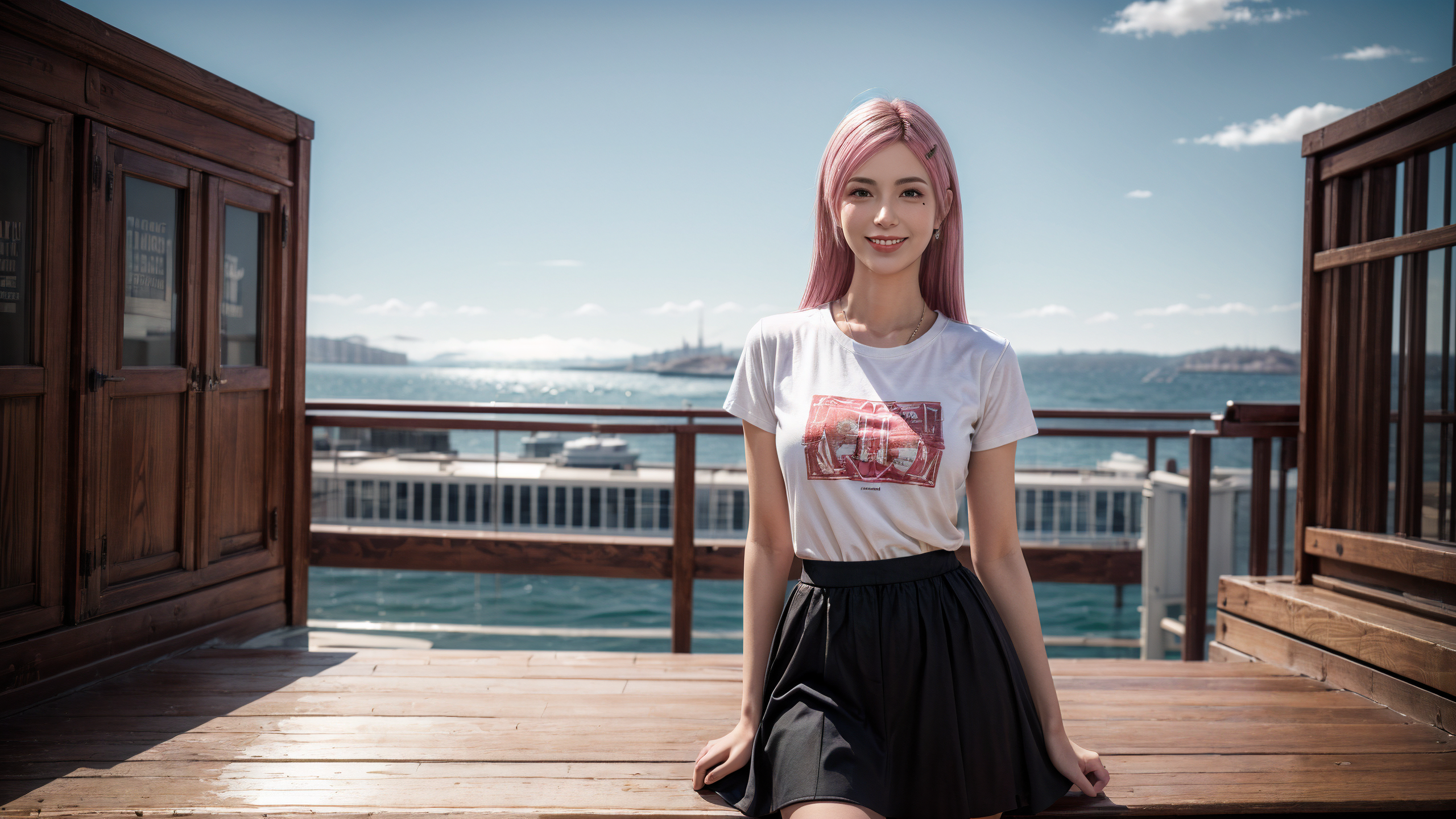 large DOF,(8k, RAW photo, best quality, masterpiece:1.2),cinematic light,ultra-detailed,hyper detailed,absurdres,realistic,photo_(medium),<lora:add_detail:1>,<lora:depth_of_field_slider_v1:1.6>,(on the ship:1.1),happy,smile,t-shirt,knotting,high-waist_skirt,white long dress,yuukananri,pink hair,green eyes,long hair,cloud,ship deck,tetsukui,sunlight,daytime,ocean,<lora:yuukananri-base-01:0.7>,