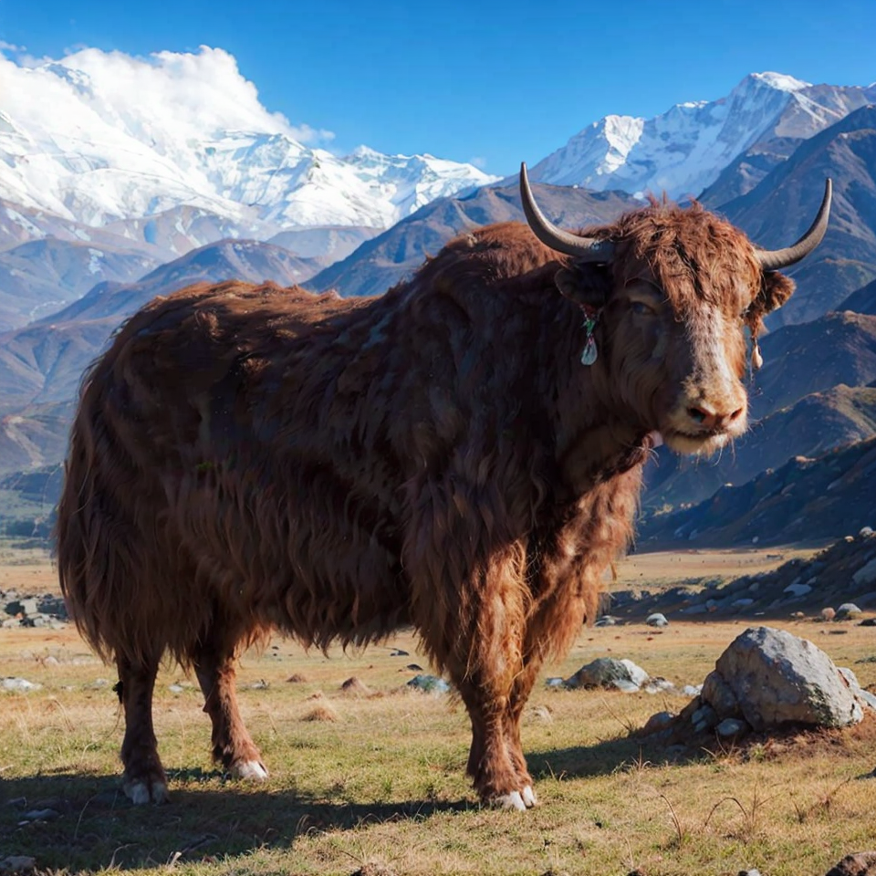 no_humans, brown yak, horns, outdoors, solo, animal, rock, grass, cloud, snow mountain, best quality, 8k, masterpiece <lora:yak_v1:0.75>