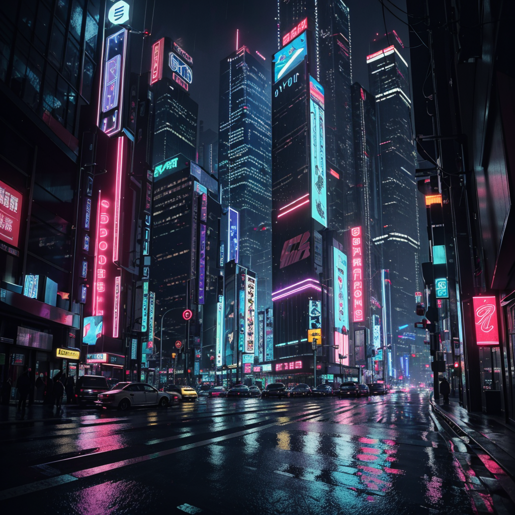 cyberpunk dark city, skyscrapers, neon lights, advertisment, night, hyper-realistic, photo, highly detailed, glass city, rainy, realism, moody cinematic, 8k, 3.5 mm, tokyo, futuristic, octane render, japanese, synthwave, cityscape, dramatic, wide angle, sci-fi, traffic, ultra realistic, glowing lights, <lora:neonPaletteLora_offset:1>