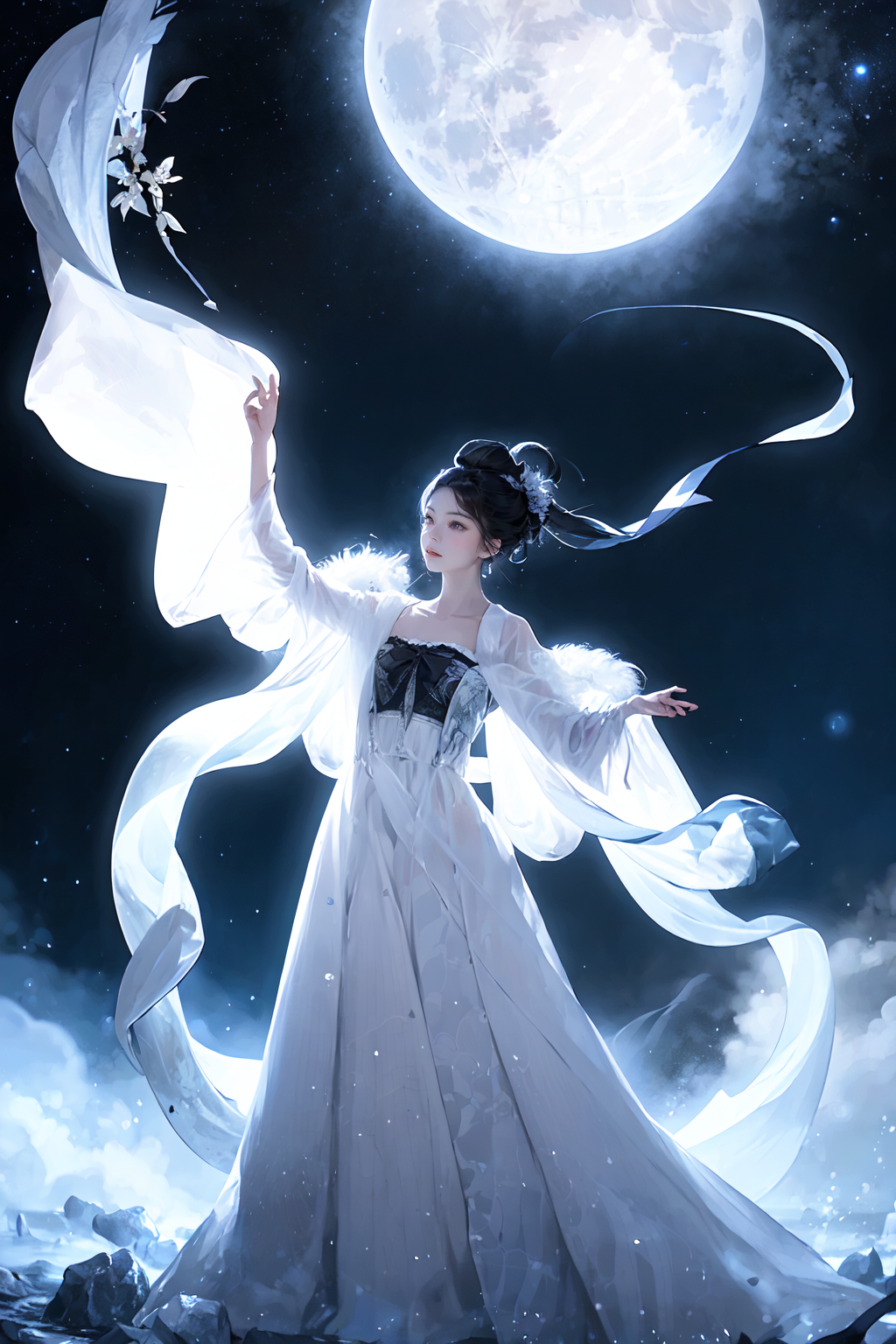 masterpiece,best quality, 1girl, full body, floating, starry sky, moon, fog, cloud, <lora:chang e_20230927004552-000008:0.8>