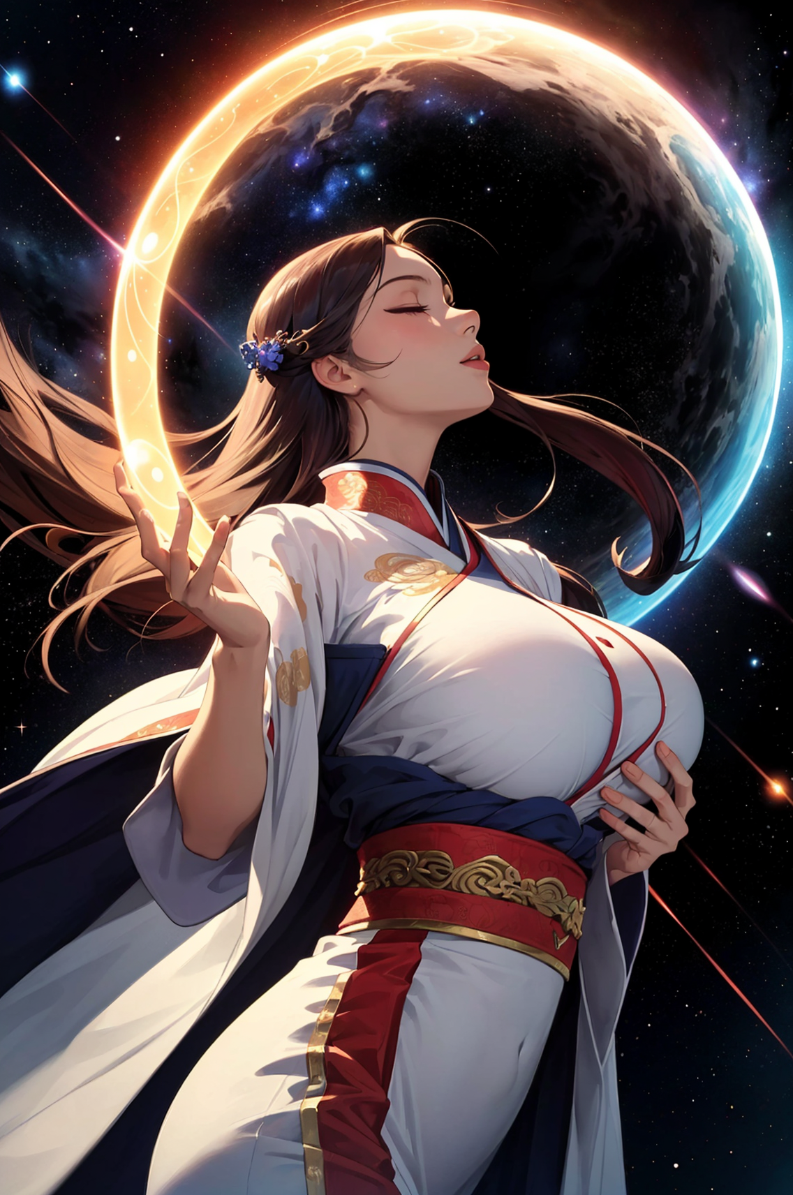 masterpiece, 1girl, solo, extremely detailed, highest detailed, 8k, official art, huge breast, space, (cosmic:1.3), stars, (long robe:1.2), (flying:1.4), (oriental clothes:1.3), (circle aura:1.3), anti gravity