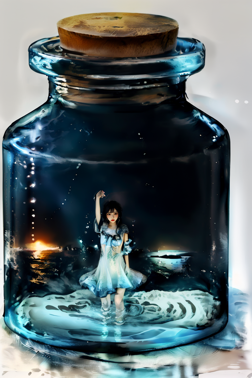 1girl,((bottle.)),Masterpiece,8K,HD,Hyperrealism,Dance,Dress,solo,whole body,random color,extremely complex background,pzsj,<lora:pzsj>,Bathing in the ocean,