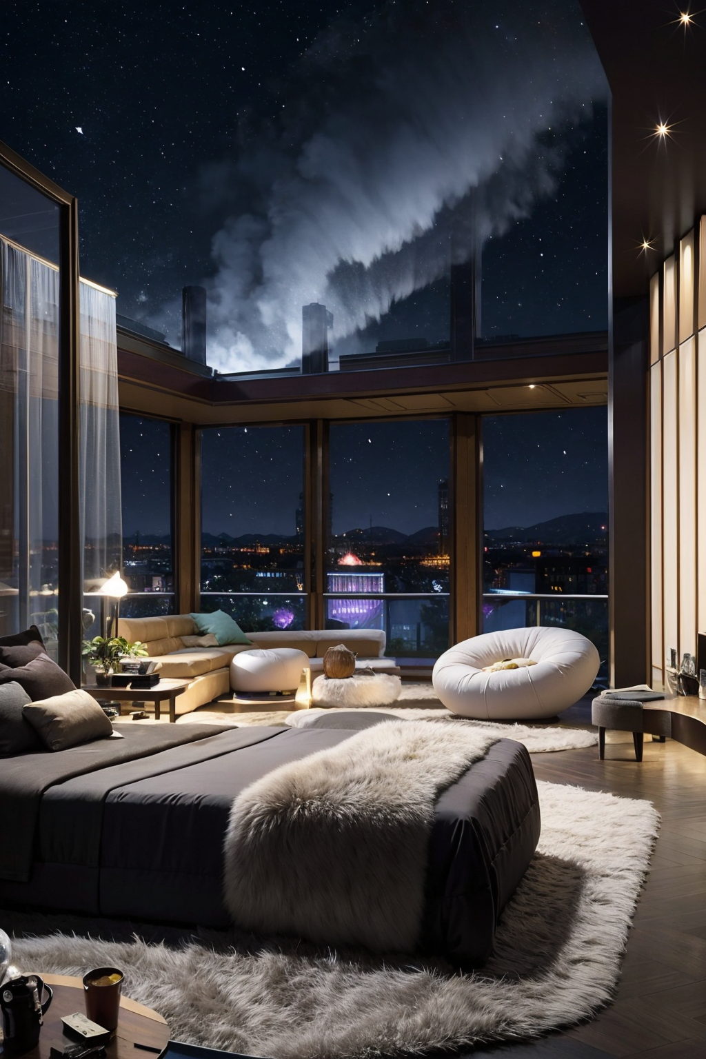 aerial_fireworks, astronaut, aurora, balcony, building, chimney, city, city_lights, cityscape, cloud, constellation, crescent_moon, dusk, fireflies, fireworks, full_moon, galaxy, gradient_sky, house, lamppost, light_particles, milky_way, moon, moonlight, night, night_sky, no_humans, onsen, pavement, planet, plant, potted_plant, power_lines, rooftop, scenery, shooting_star, sky, skyline, skyscraper, snow, snowing, space, starry_background, starry_sky, starry_sky_print, sunrise, tanabata, tanzaku, telescope, town, tree, twilight, window, winter, indoors, cup, pillow, bed, chair, table, curtains, couch, door, lamp, flower_pot, room2<lora:room2:1>
