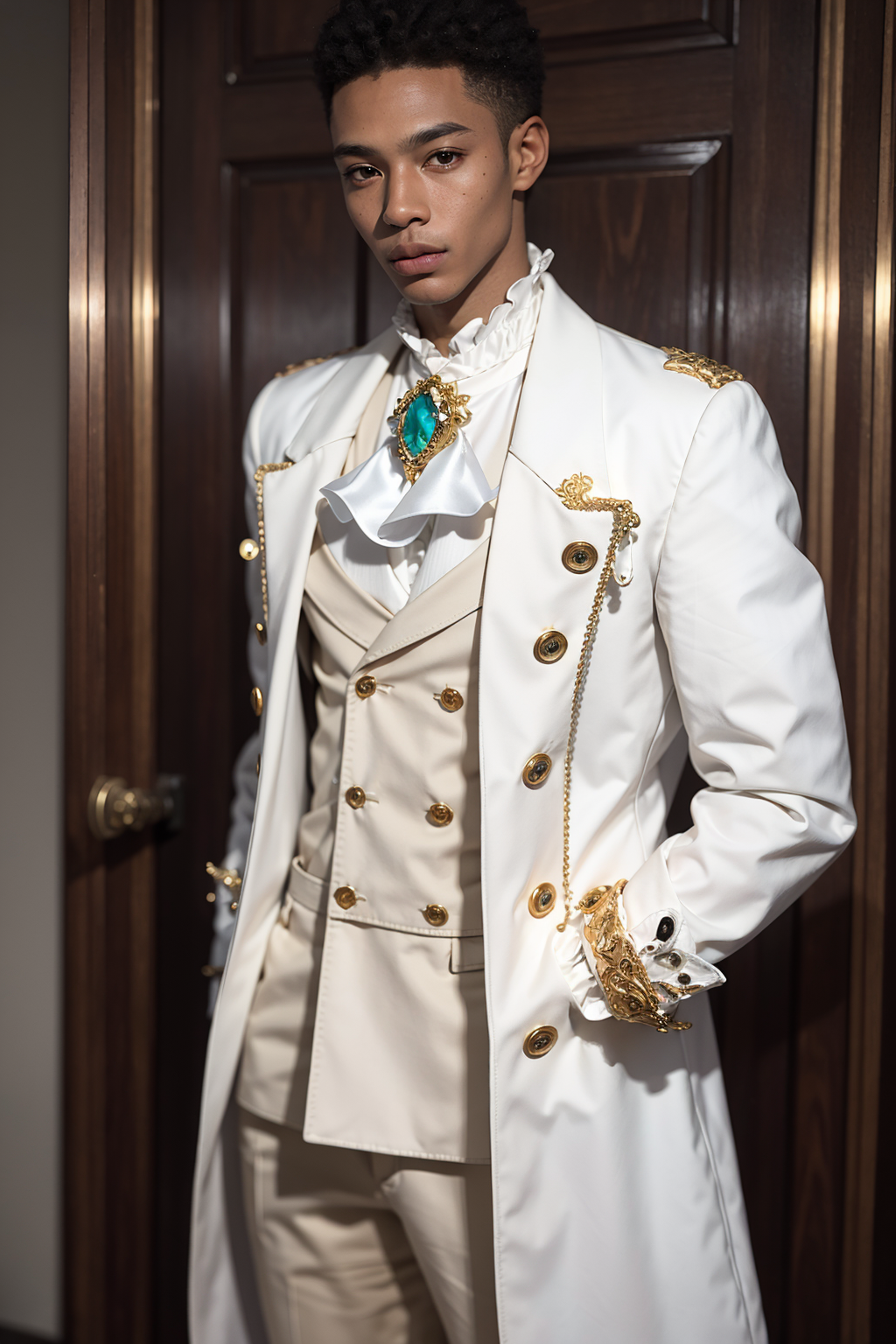 masterpiece,1boy, buttons, solo, white_gloves, shirt, long_sleeves, jewelry, closed_mouth, standing, jacket, white_shirt, male_focus, cowboy_shot, frills, pants, indoors, dark_skin, lips, coat, black_pants, white_jacket, brooch, gem, facing_viewer, arm_at_side, gold_trim, hand_in_pocket, realistic, door, arms_at_sides, head_out_of_frame, white_coat, double-breasted, Princecore, outfit<lora:Princecore:0.8:OUTD>