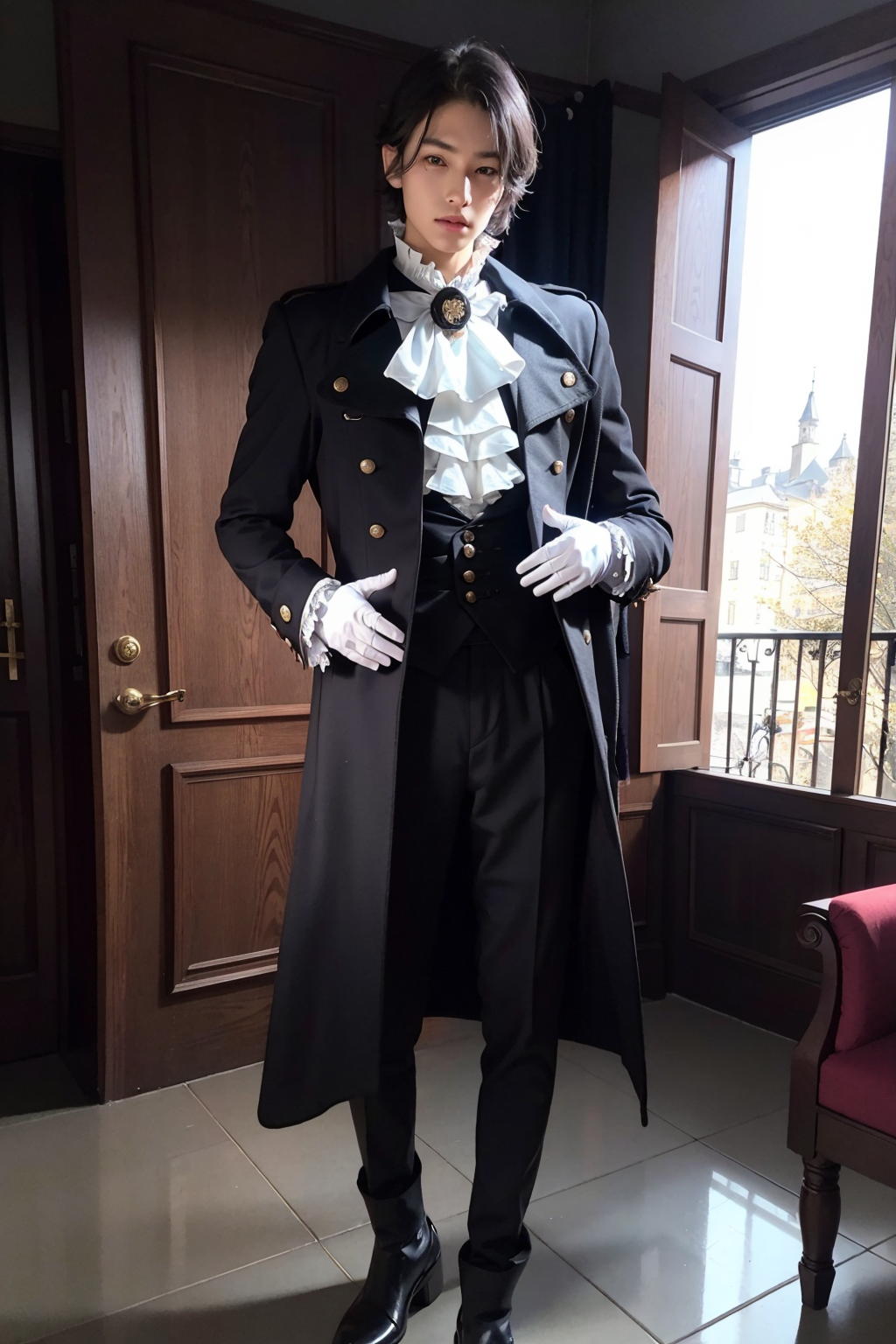masterpiece,1boy,black_coat, buttons, coat, gloves, skirt, shirt, long_sleeves, standing, jacket, white_shirt, frills, black_gloves, pants, indoors, vest, ascot, no_humans, Princecore, outfit<lora:Princecore:0.8:OUTD>