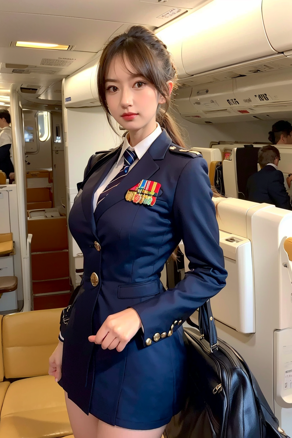 (best quality, masterpiece:1.2), (extremely intricate detail),high sharpness,extremely delicate and beautiful, beautiful and aesthetic,flight attendant,flight stewardess, airline stewardess,on the airliner,stewardess uniform,showing panties:1.3,stewardess ,small breasts,nice hairstyle,with hair up,charming face,yellowish brown hair, <lora:Moral boundary_yan:0.9>,