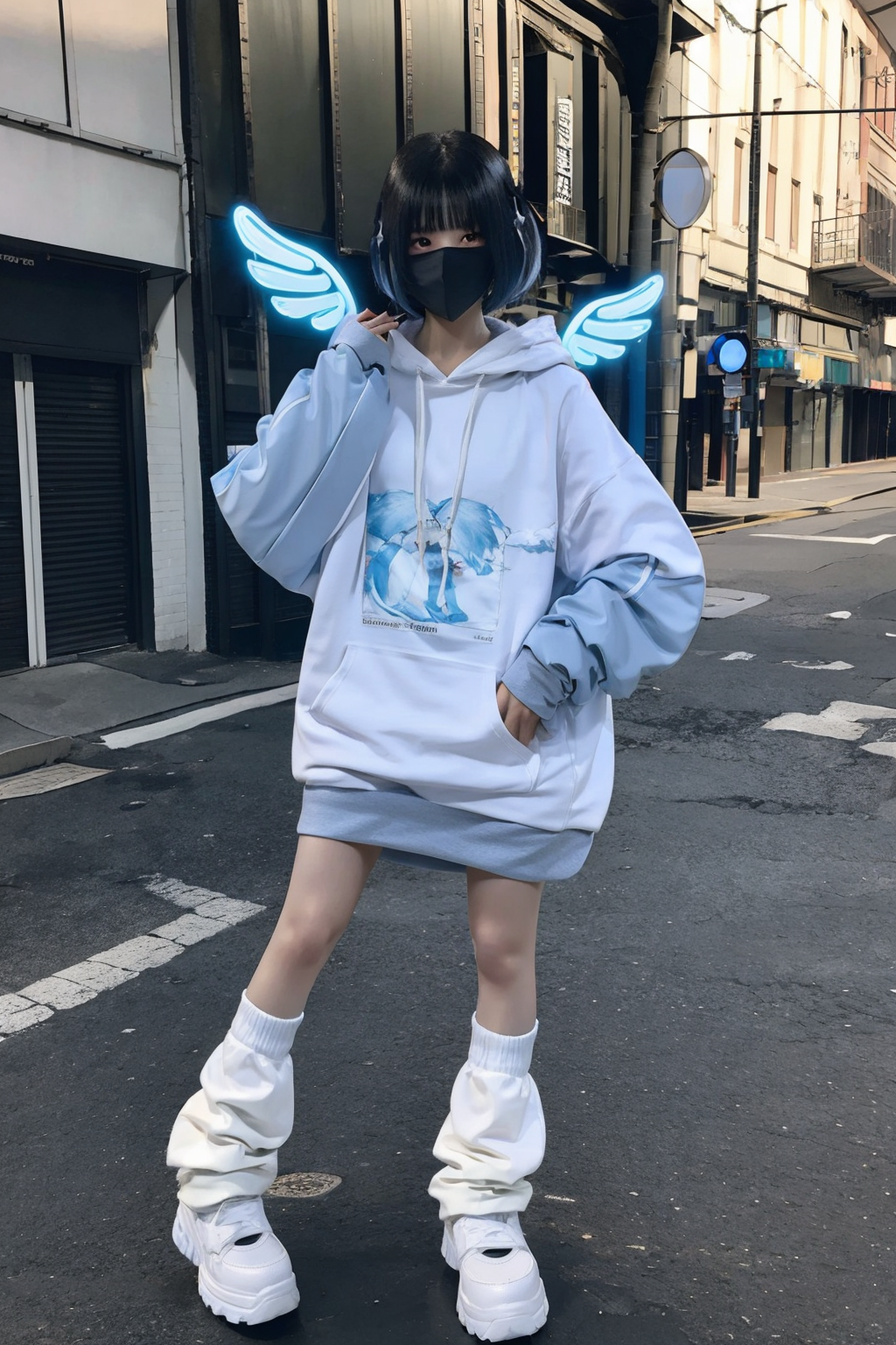 1girl, black_hair, short_hair, sleeves_past_wrists, solo, white_footwear, shirt, long_sleeves, standing, wings, socks, hood, hoodie, sleeves_past_fingers, angel_wings, Mizuiro, bright light,outfit<lora:Mizuiro:1>