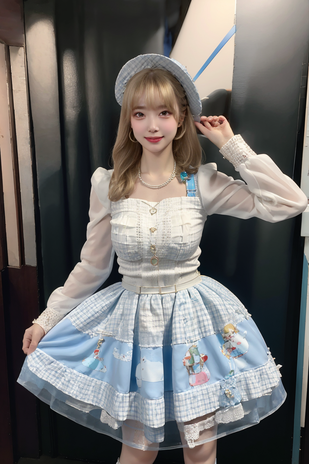 1girl, dress, jewelry, lips, long_sleeves, looking_at_viewer, necklace, realistic, solo, white_dress, smile, bangs, blonde_hair, hat, brown_eyes, earrings, blue_dress, skirt_hold, hand_on_headwear, plaid_dress, voice_actor, Mizuiro, outfit<lora:Mizuiro:1>