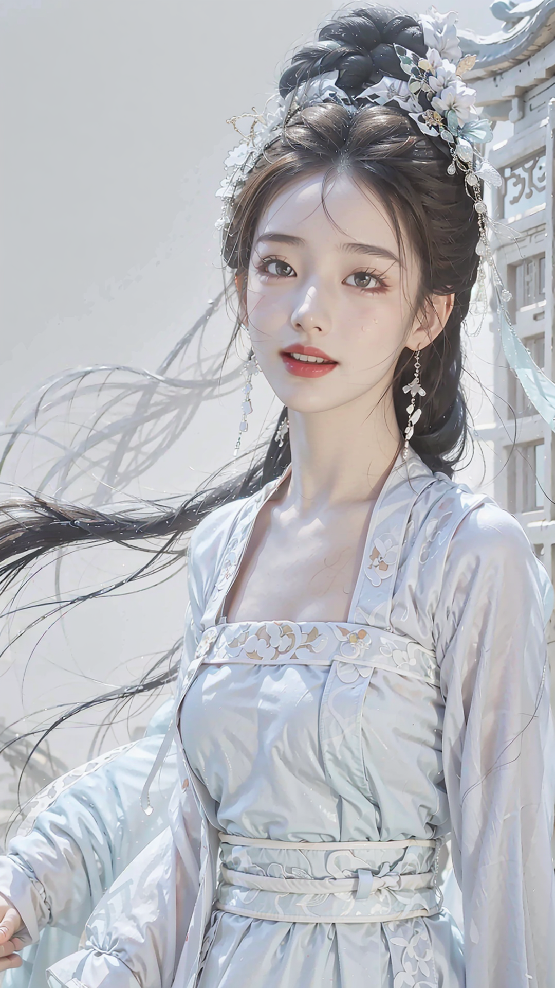 Best quality,masterpiece,ultra high res,(photorealistic:1.4), Blue sky and white clouds,wind blow,Chinese architecture of the Song Dynasty,Cinematic lighting, 1girl,solo,real skin,<lora:Clothes_beizi:0.6>,clothes1beizi,hanfu,very long hair,huge breasts,double_bun,Chinese Song Dynasty elements,jewelry,long legs,light smile,<lora:huangyuyao:0.7>,