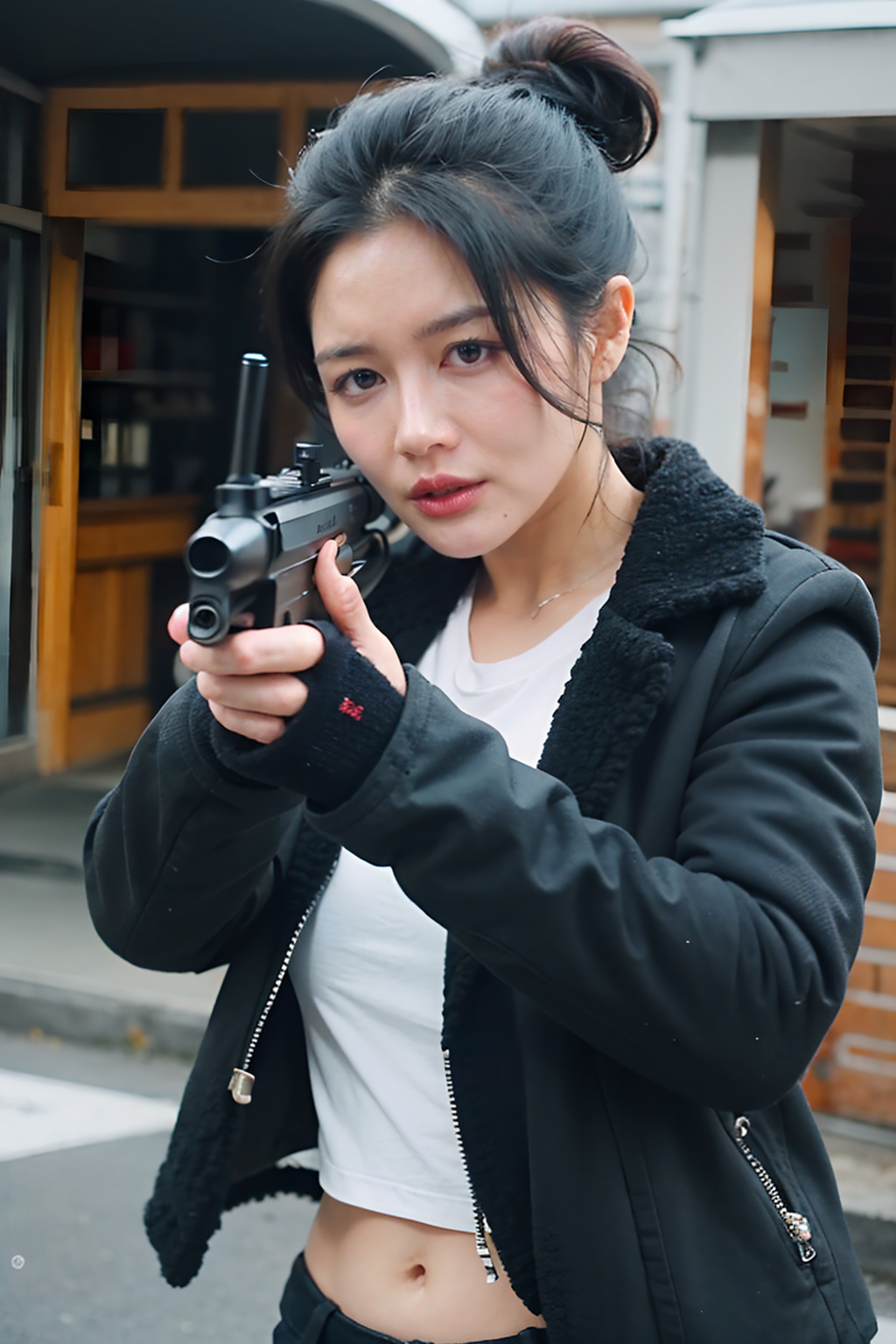 <lora:ChenMan1.0:0.75>,1girl,solo,hair bun,frown,(looking through gun:1.2), white shirt,black gloves,fingerless gloves,black jacket,midriff, weapon,gun,holding weapon,handgun,gun with both hands, blurry background,upper body, masterpiece,best quality,ultimate details,highres,8k,wallpaper,extremely clear,