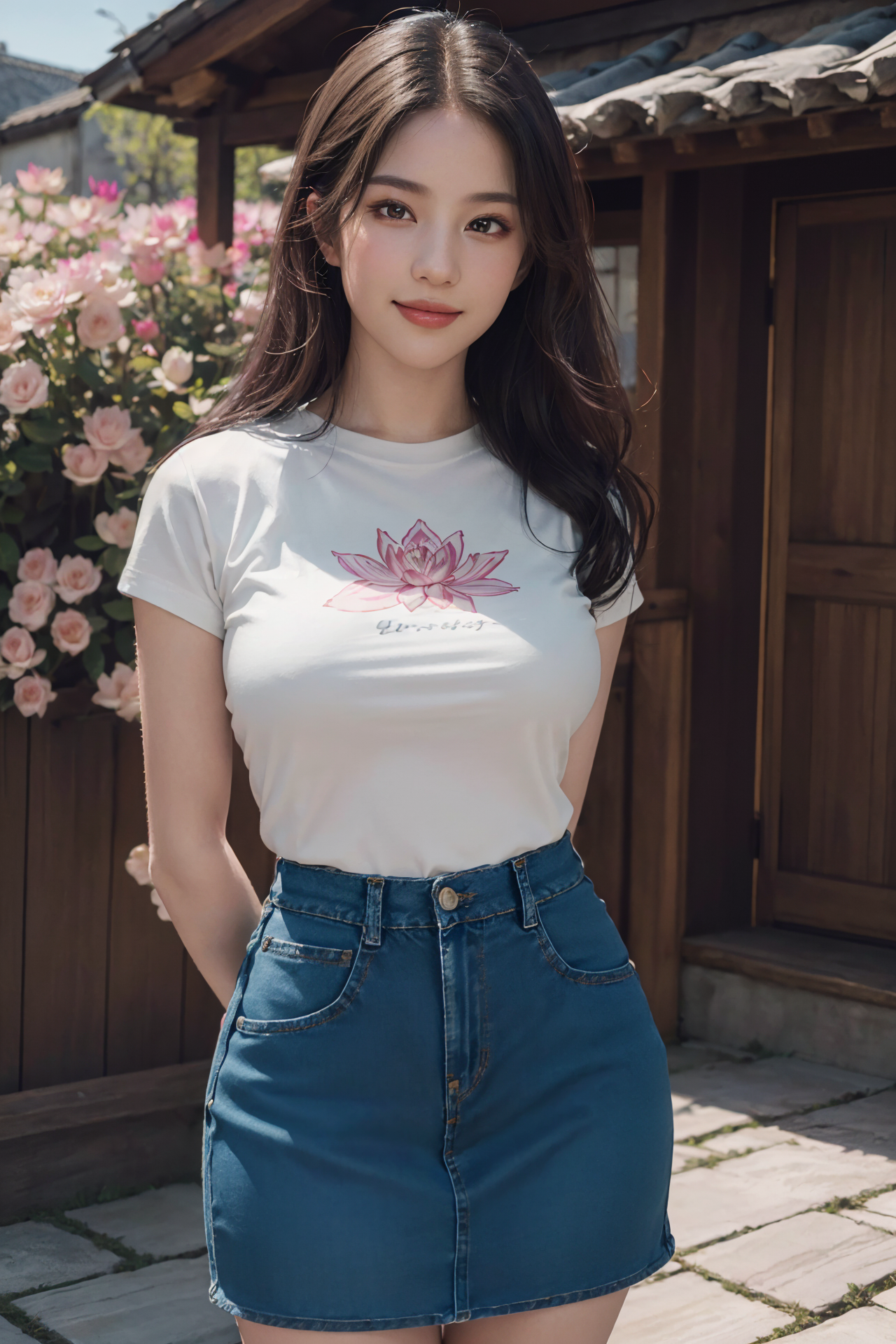 (4k, best quality, highres, absurdres, masterpiece:1.21), (realistic:1.331), detailed and intricate, cinema light, (authentic skin texture:1.3), 1girl, perfect body, medium breasts, shiny skin, light smile, arms behind back, t-shirt, denim skirt, tight clothes, tight-fitting, courtyard, flower, petals, lotus, wooden house, stone, <lora:add_detail:0.3>, <lora:girlslike_lyf20:0.7>