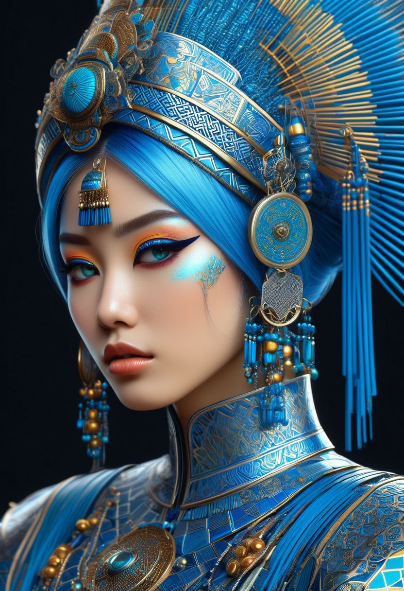 (high quality), (masterpiece), (detailed), 8K, Hyper-realistic digital illustration portrays (Japanese woman1.3) with vibrant (blue hair1.4) styled in an elaborate (Tunisian-inspired1.2) headdress. Her (upper body1.2) is adorned with a futuristic (armor1.3) embellished with intricate (Moroccan1.2) tile patterns and ornate (jewelry1.2), blending modern technology with ancient cultural heritage. Her (expressive eyes1.3) shine with a bright, adventurous spirit, and her (smooth skin1.2) glows with a subtle, cerulean luminescence. In style of Ash Thorp, trending on DeviantArt.