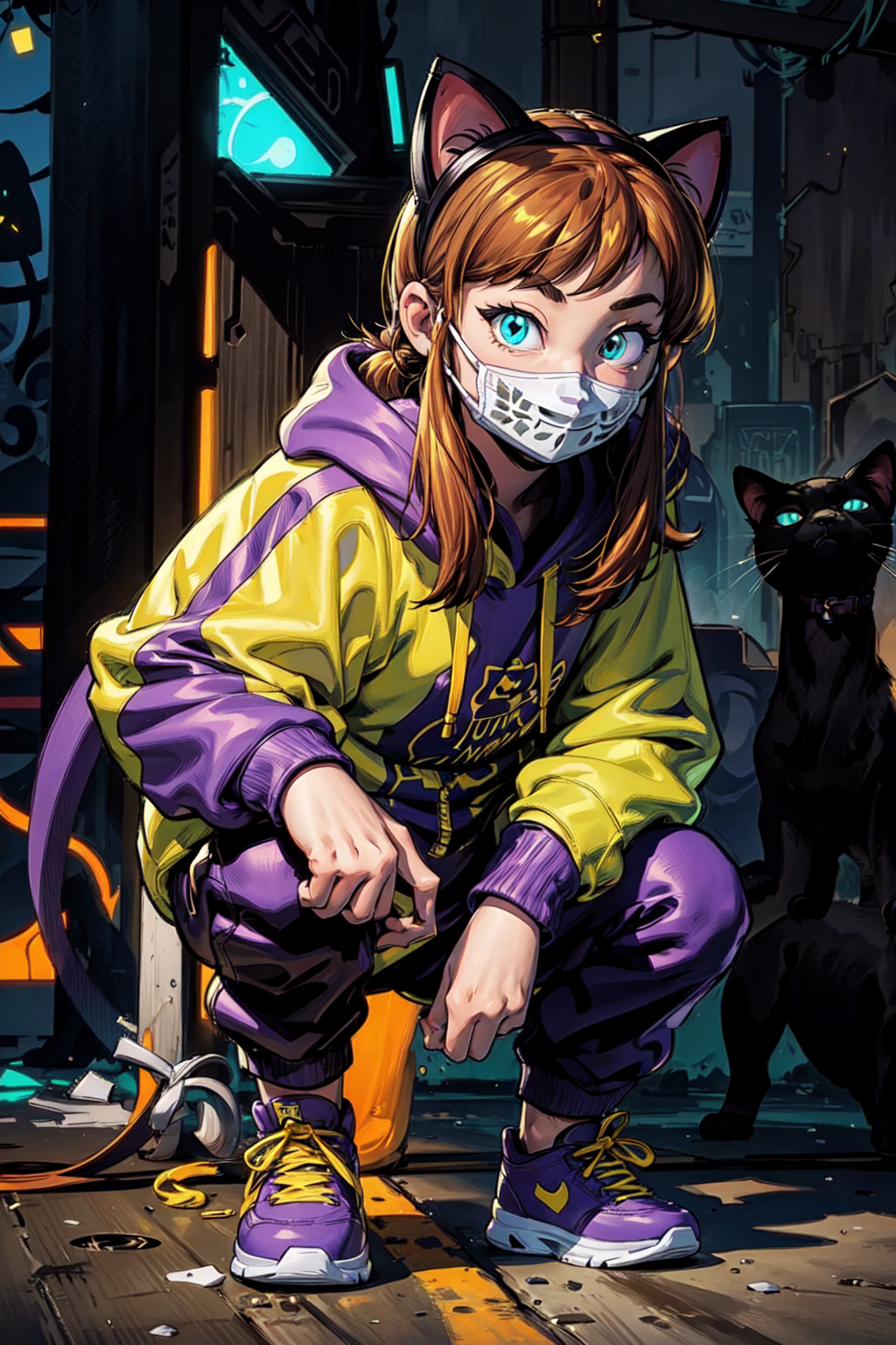 thick outlines, comics, photorealistic, perfect hands, masterpiece:1.2, colorful, 1girl, solo, <lora:Hat:0.7>, hknya, purple hoodie, yellow sleeves, black pants, cat ears, sneakers, face mask, detailed background, night, neon, metro, black cats, shadows, hourglass, detailed face, detailed eyes, <lora:add_detail:0.7>