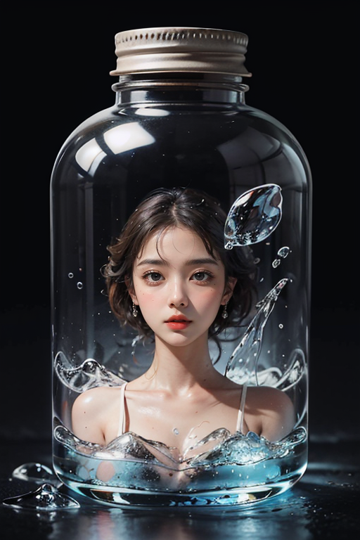 masterpiece,best quality,8k,original,official art,photorealistic,raw photo,photores, 1girl,glass bottle,Girl floating in the water,a bottle full of water,air_bubble,style-swirlmagic,asian-girl,<lora:ç¶ä¸å°å¥³_ç»çå¨ç¿æ¦å¿µlora_1.0:0.7>,