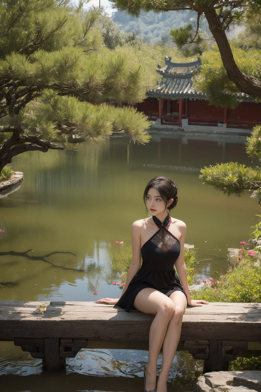(masterpiece, best quality), absurdes, 1girl, pretty dress, beautiful Finnish girl, black short hair, sitting, from below, crossed legs, panty, cowboy shot, (Chinese garden, fractal:1.2)