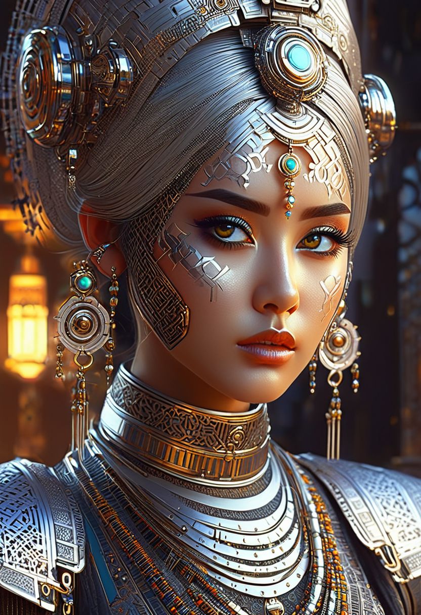 (high quality), (masterpiece), (detailed), 8K, Hyper-realistic digital illustration depicts (Japanese woman1.3) with striking (silver hair1.4) styled in an intricate (Moroccan-inspired1.2) updo. Her (upper body1.2) is clad in a futuristic (exosuit1.3) adorned with ornate (Tunisian1.2) patterns and delicate (jewelry1.2), blending modern technology with ancient cultural heritage. Her (piercing eyes1.3) shine with an intense inner light, and her (delicate skin1.2) glows with a subtle, metallic luminescence. In style of Ian McQue, trending on Artstation.