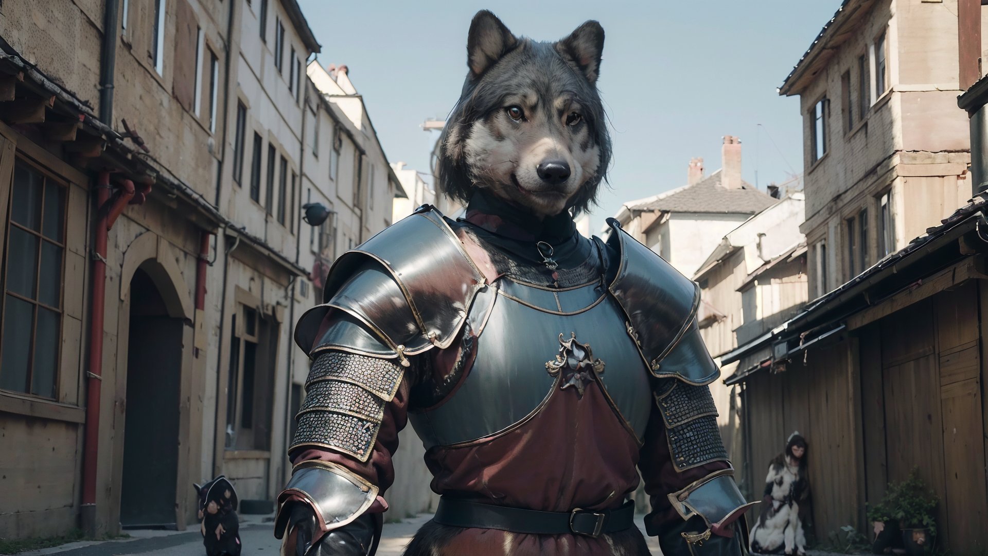 1 person, (anthropomorphic ([dog|(wolf:0.5)]:1.4):1.6) (knight:1.2), (extremely detailed hyperrealistic masterpiece, best quality, high resolution uncompressed raw photo:0.95), wearing ancient ((european) armor:1.2), (stern:1.2) warrior, valiant, (medieval europe:1.3), holding a halberd, standing guard. upper body photo