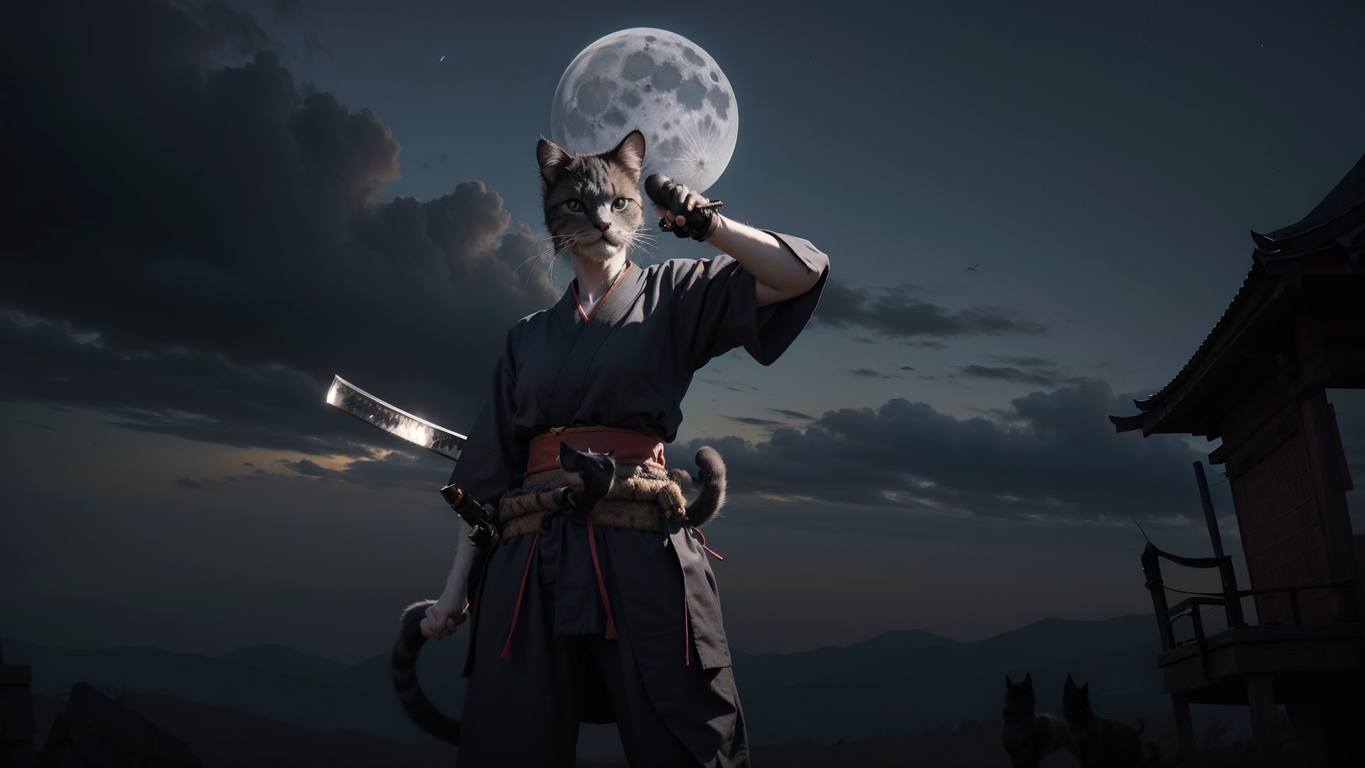 (agressive and powerful:1.2) (anthropomorphic ((cat)):1.4) (samurai:1.2), (extremely detailed hyperrealistic masterpiece, best quality, high resolution uncompressed raw photo:0.85), wearing ancient ((japanese) armor:1.2) (holding a sheathed katana:1.6), (stern:1.6) swordsman, (wide shot:1.4), gloomy, (atmospheric:1.6), agressive, ancient japan, dark at night, outdoors, under moonlit sky at (dark midnight:1.4), candle lit, torchlight