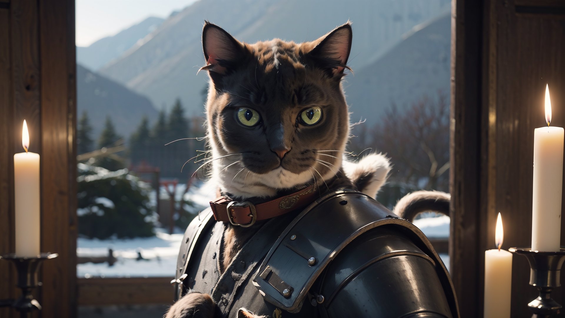 (anthropomorphic (cat):1.6) samurai, extremely detailed hyperrealistic masterpiece, best quality, high resolution uncompressed raw photo, wearing ancient ((japanese) armor:1.2) with a (katana:1.3), atmospheric, ancient japan, gloomy, candle lit