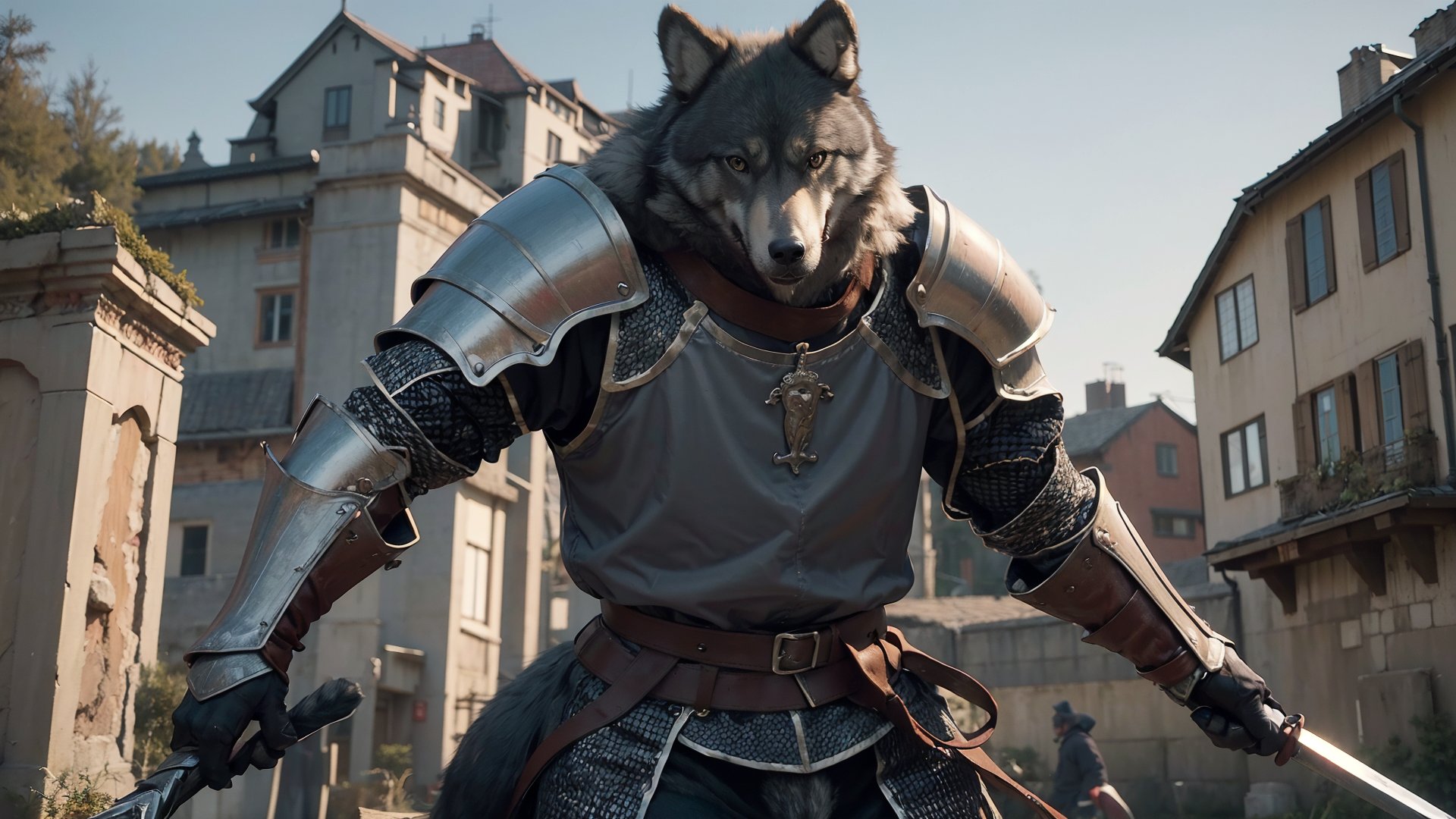 (anthropomorphic (([dog|wolf])):1.45) (knight:1.2), (extremely detailed hyperrealistic masterpiece, best quality, high resolution uncompressed raw photo:0.9), wearing ancient ((european) armor:1.2), (stern:1.2) warrior, valiant, (medieval europe:1.3), wide shot, wielding a halberd