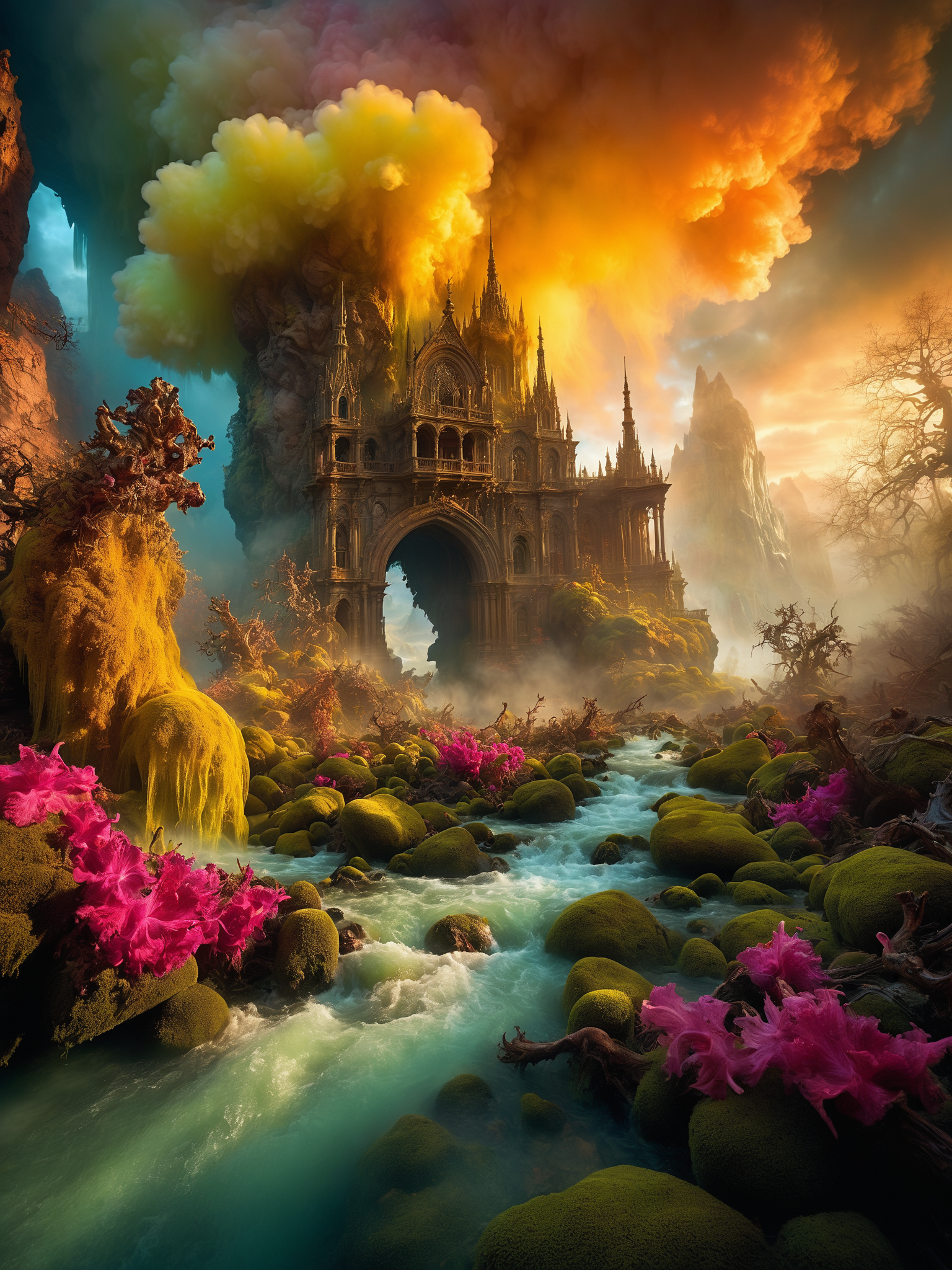 style by Kim Keever best quality,high resolution,cinematic wide angle,playful-shadows,masterpiece,majestic,epic realistic landscape where the veil of reality is thin and the essence of legend permeates the air,huge detailed complex scene,
